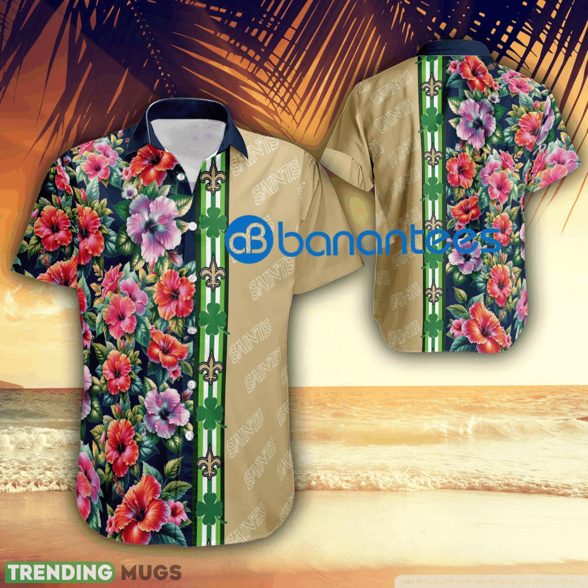 Featuring the iconic New Orleans Saints logo, this shirt allows you to proudly display your support for your favorite football team. The vibrant hibiscus flower pattern adds a touch of tropical flair, making it a standout choice for any occasion.