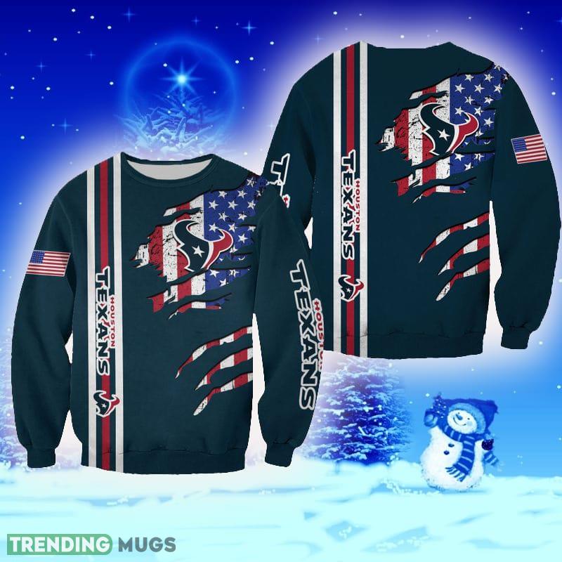 Featuring a unique American flag design, this sweater proudly displays your love for both your country and your favorite football team. The combination of the iconic Houston Texans logo and the stars and stripes of the American flag creates a truly patriotic and festive look.