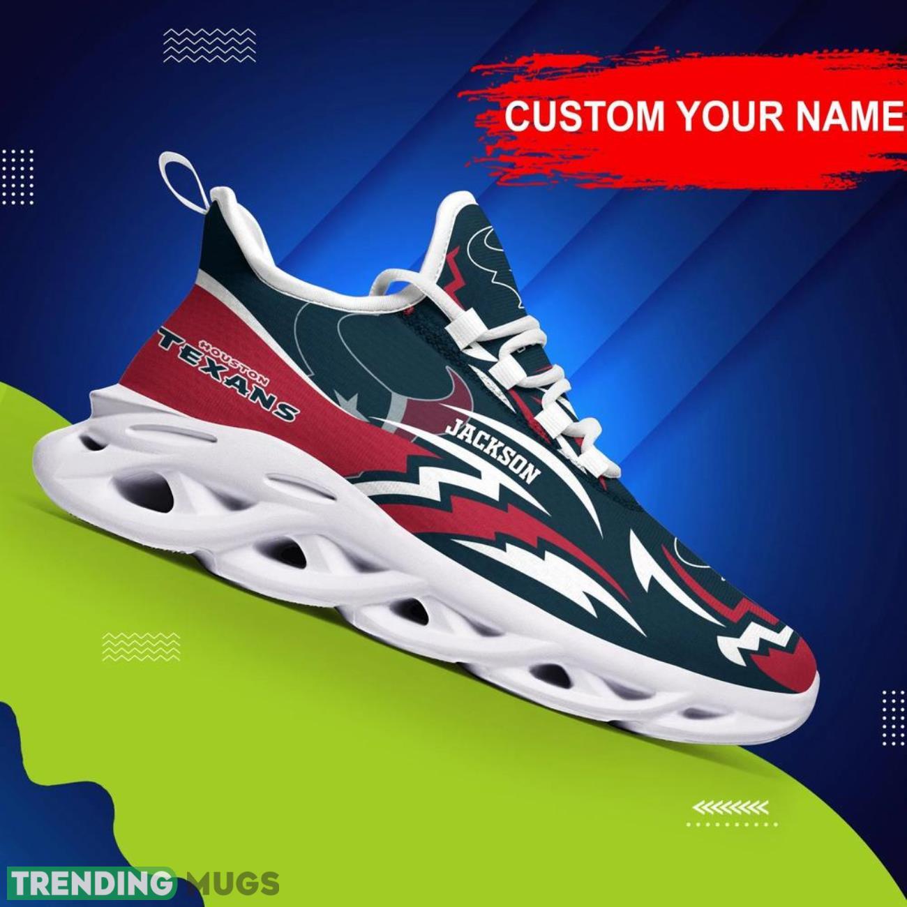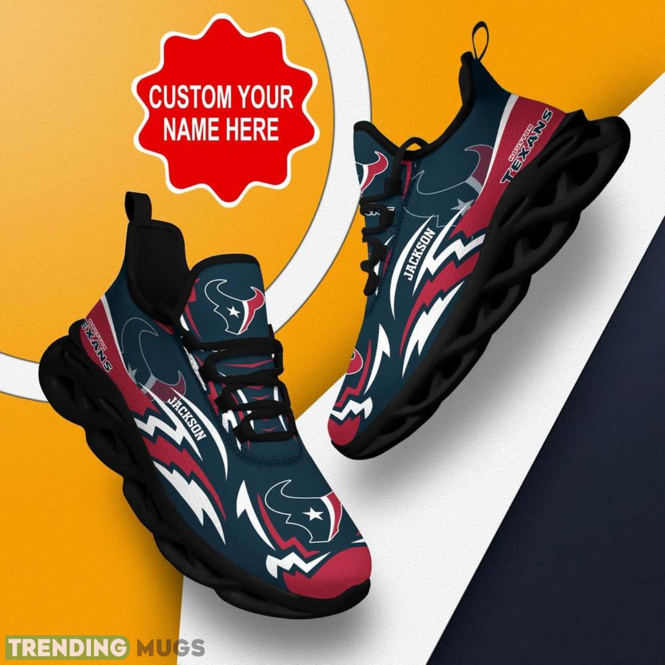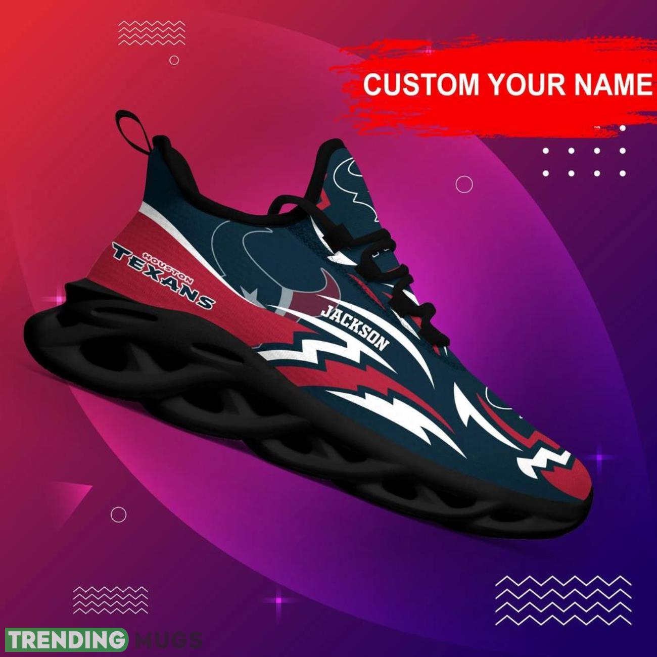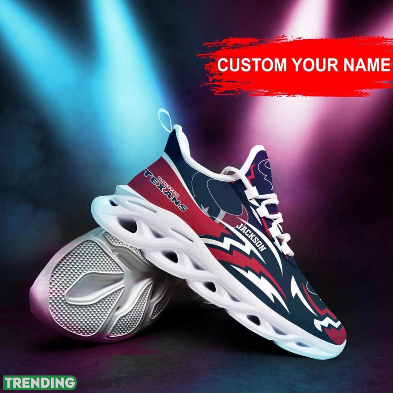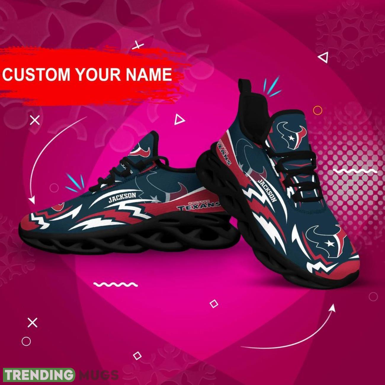 Show off your team pride in style with our Houston Texans NFL Max Soul Shoes! These custom name sneakers are the hottest trend for NFL big fans. Personalize them with your name and stand out from the crowd at every game or event. Made with high-quality materials, these shoes are not only fashionable but also comfortable to wear all day long. Treat yourself or surprise your favorite NFL enthusiast with the perfect personalized gift. Get your hands on these trending sneakers now and elevate your fan gear to the next level!