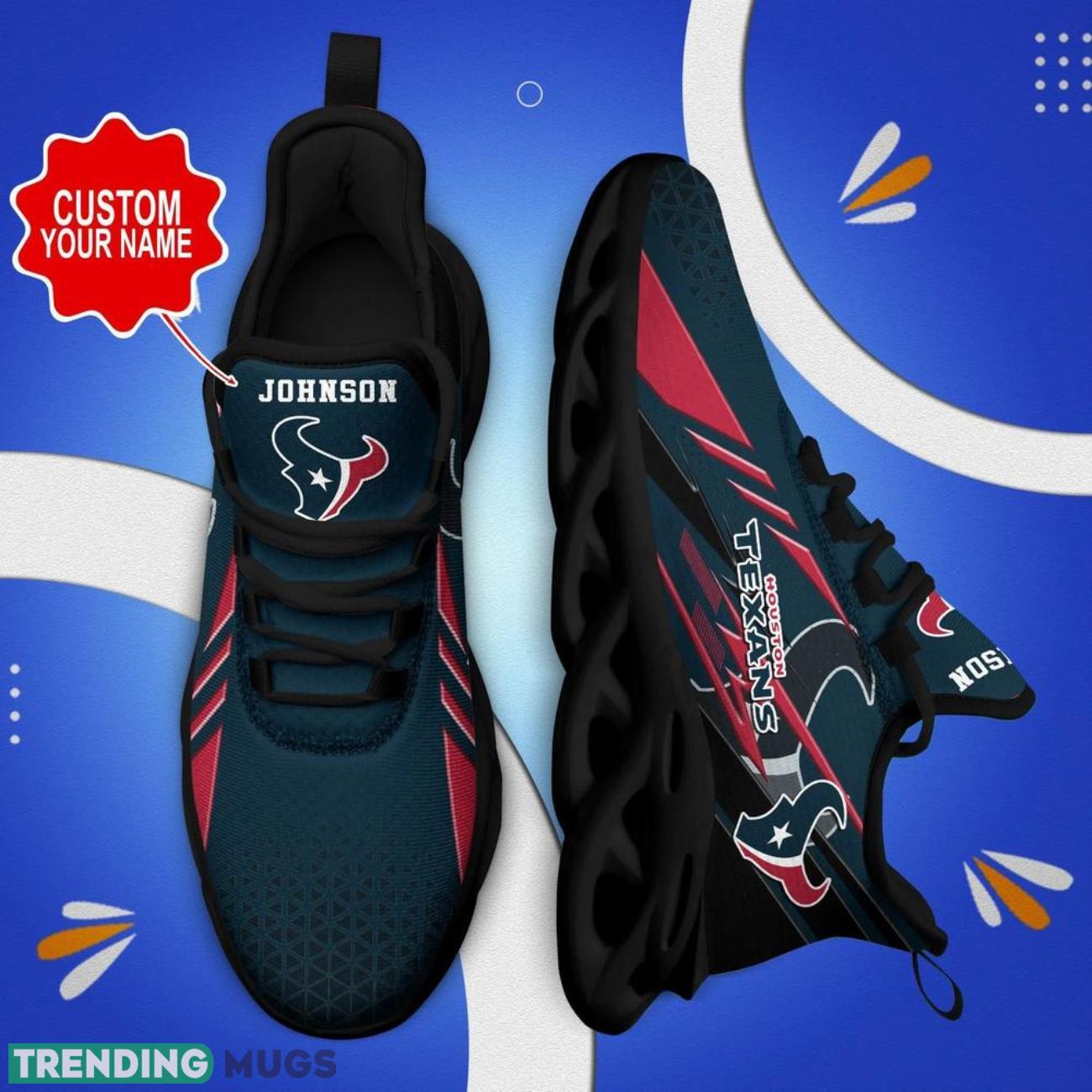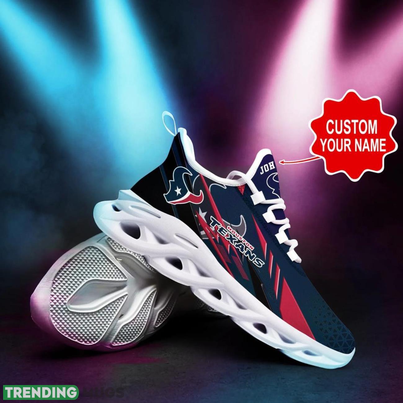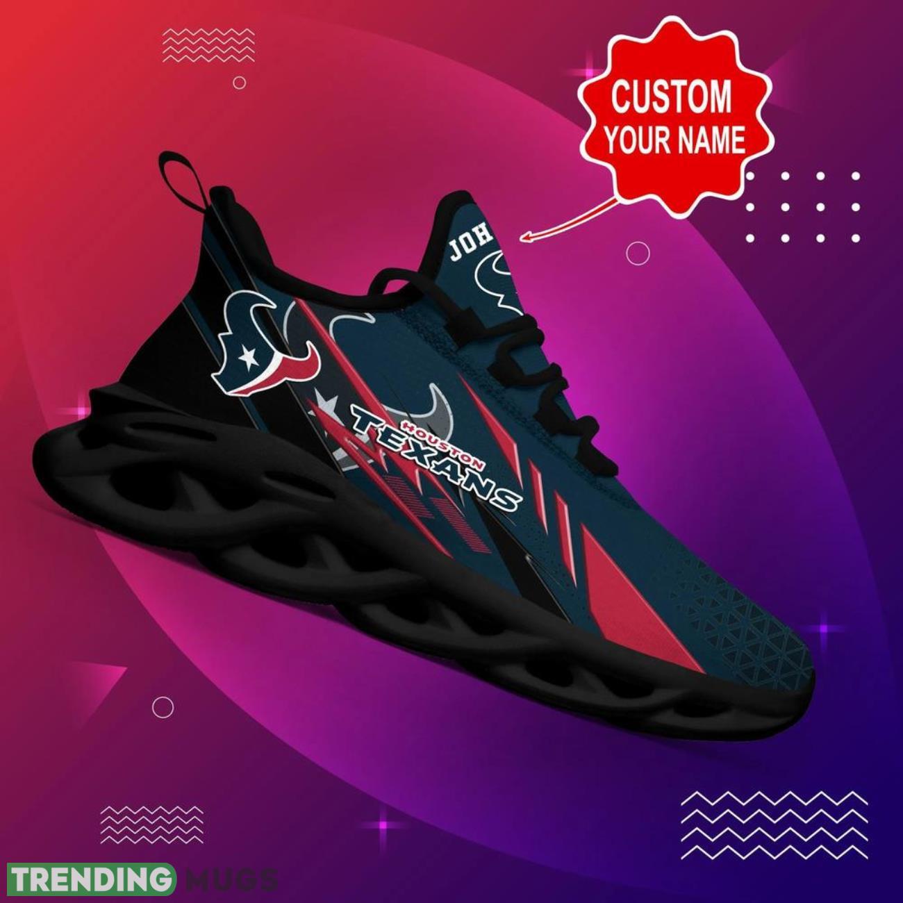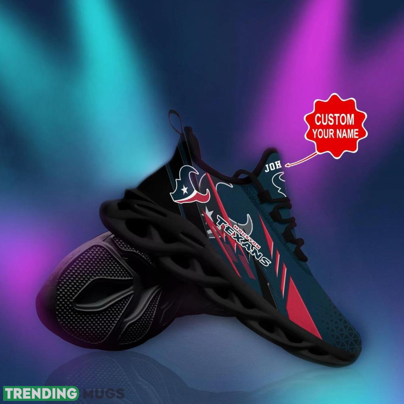 This Houston Texans NFL Max Soul Shoes Personalized Name Gifts Trending Running Shoes is a breathable, lightweight, and comfortable casual outdoor shoe that has a unique design. It is made of a mesh fabric which makes it sweat absorbent and breathable, while the rubber bottom ensures traction, comfort, and durability. It is available in two colors: black or white sole. There are two styles of shoelace holes so you can choose your preference.