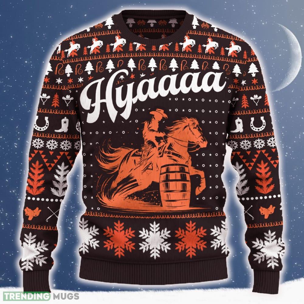 Gear up for the holiday season with our Hyaaaa Barrel Racing Cowboy Christmas Tree AOP Sweater! This unique and eye-catching sweater is the perfect gift for both men and women who love to embrace the spirit of Christmas while showcasing their love for barrel racing and cowboy culture.