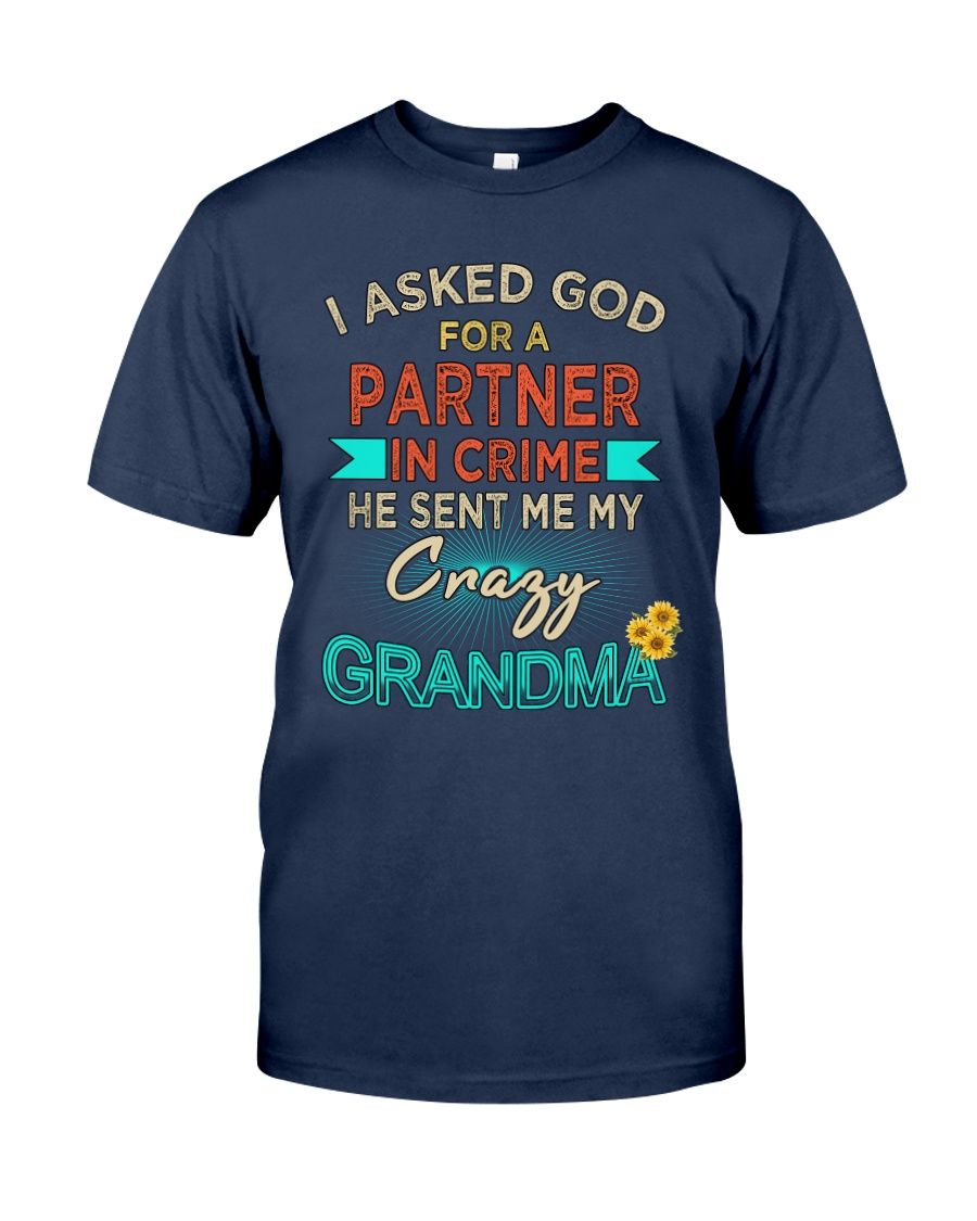 I Asked God For A Partner In Crime He Sent Me Crazy Grandma Sunflower Shirt. This could be a perfect gift for your family. This shirt available in t-shirt, hoodies, long sleeve and tank top.