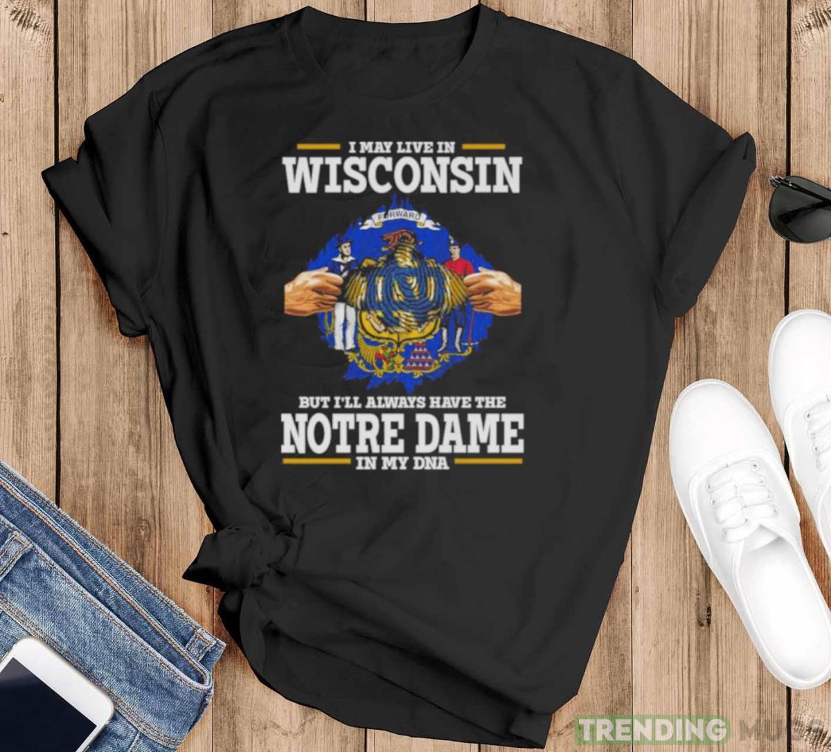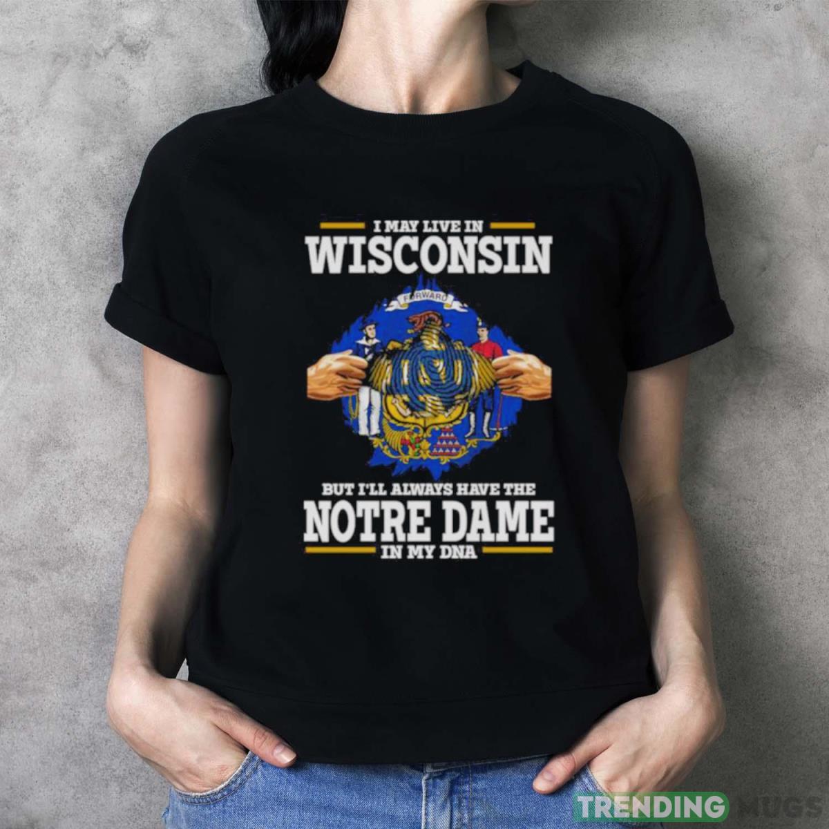 I May Live In Wisconsin But I’ll Always Have The Notre Dame Fighting Irish In My DNA 2023 shirt – Black T-Shirt