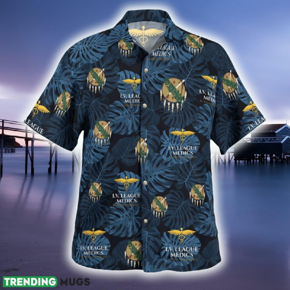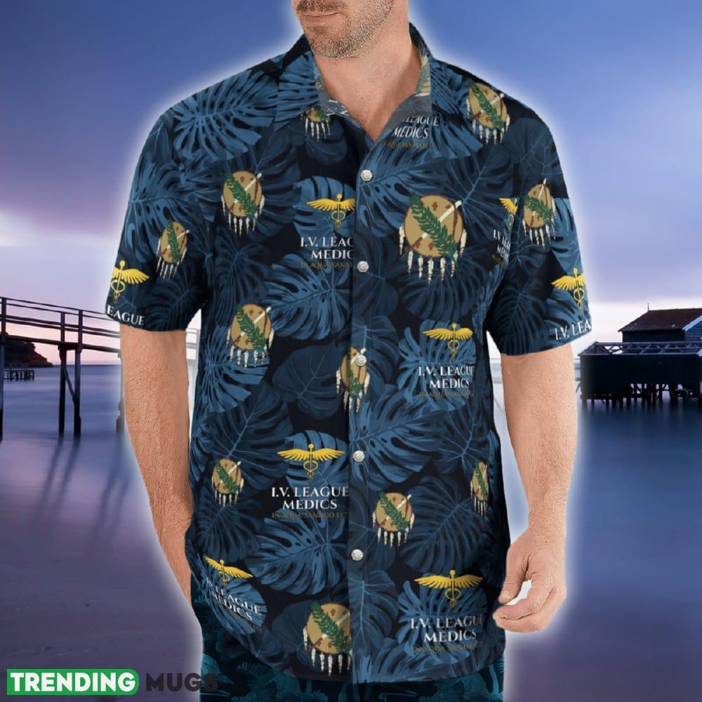 Elevate your summer style with the I.V. League Medics Hawaiian Shirt Palm For Summer. Embrace the tropical vibes with this vibrant palm print shirt, perfect for lounging on the beach or sipping cocktails by the pool. Made from lightweight, breathable fabric, this shirt will keep you cool and stylish all season long. Stand out from the crowd in this must-have summer essential. Upgrade your wardrobe with the I.V. League Medics Hawaiian Shirt Palm For Summer today!