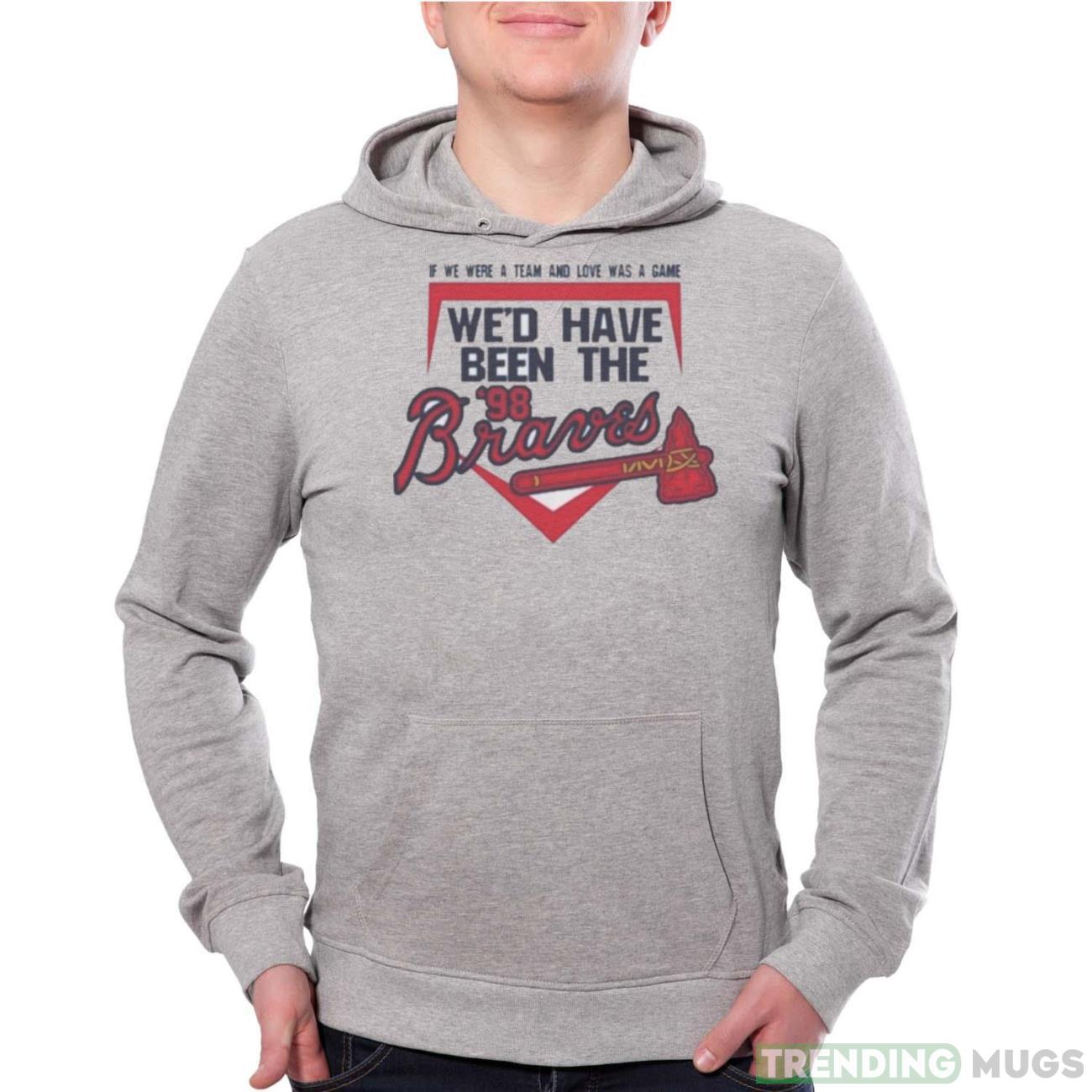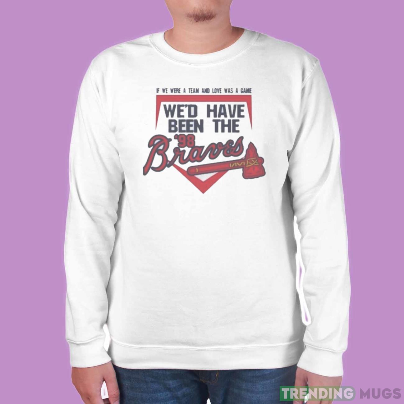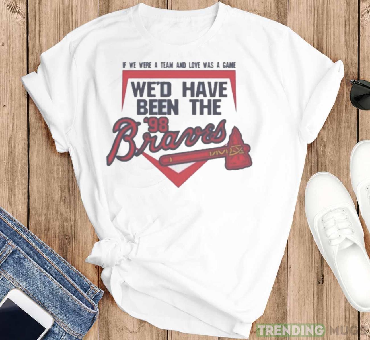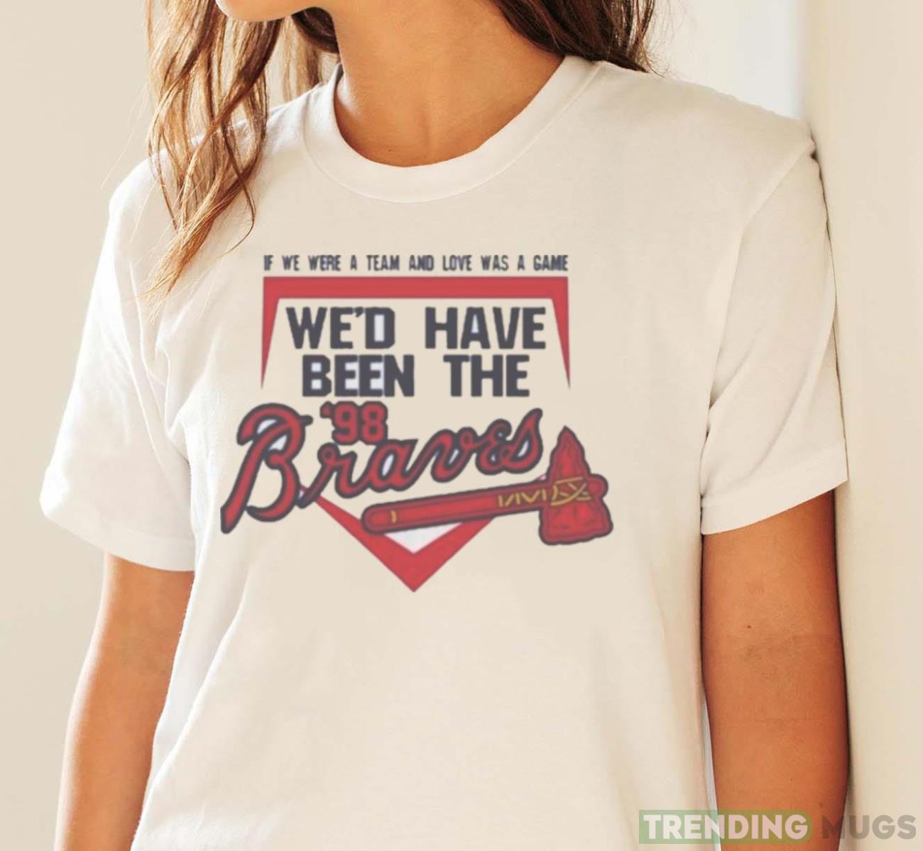 The captivating print on the front showcases the iconic Atlanta Braves logo, paying tribute to the legendary team of ’98. The bold statement, “If We Were A Team And Love Was A Game, We’d Have Been” adds a dash of romance, making this shirt a unique expression of your love for the Braves and the game itself.