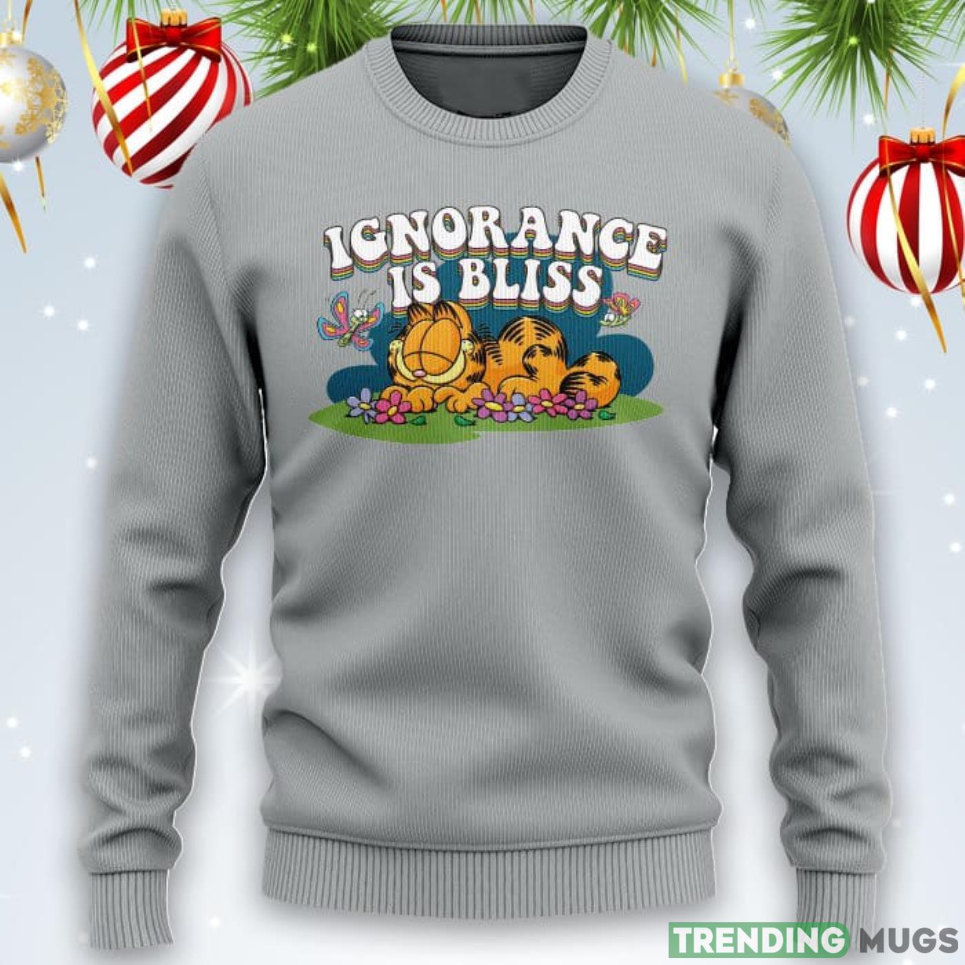 Introducing the Ignorance Is Bliss Garfield Sweater. This stylish sweater is perfect for anyone who wants to stay warm and comfortable during chilly weather. Featuring a classic Garfield cartoon image, this sweater is sure to please any fan of the popular character.
