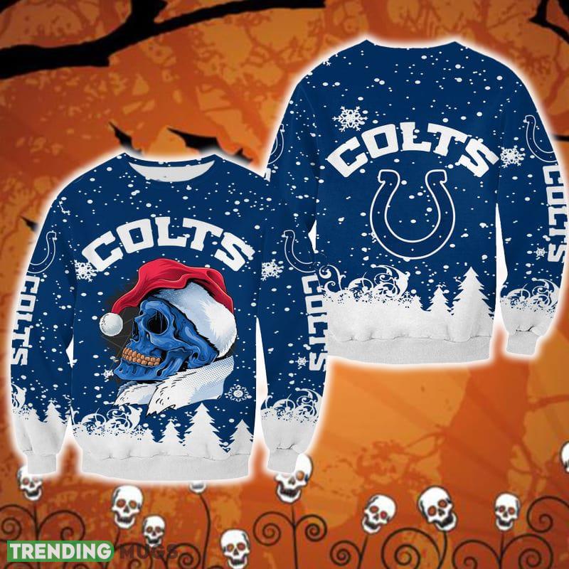Featuring a unique combination of holiday and Halloween elements, this sweater is sure to make a statement at any holiday gathering. The eye-catching design includes a fun mix of Colts logos, Christmas skulls, and garland accents, creating a one-of-a-kind look that is both festive and quirky.