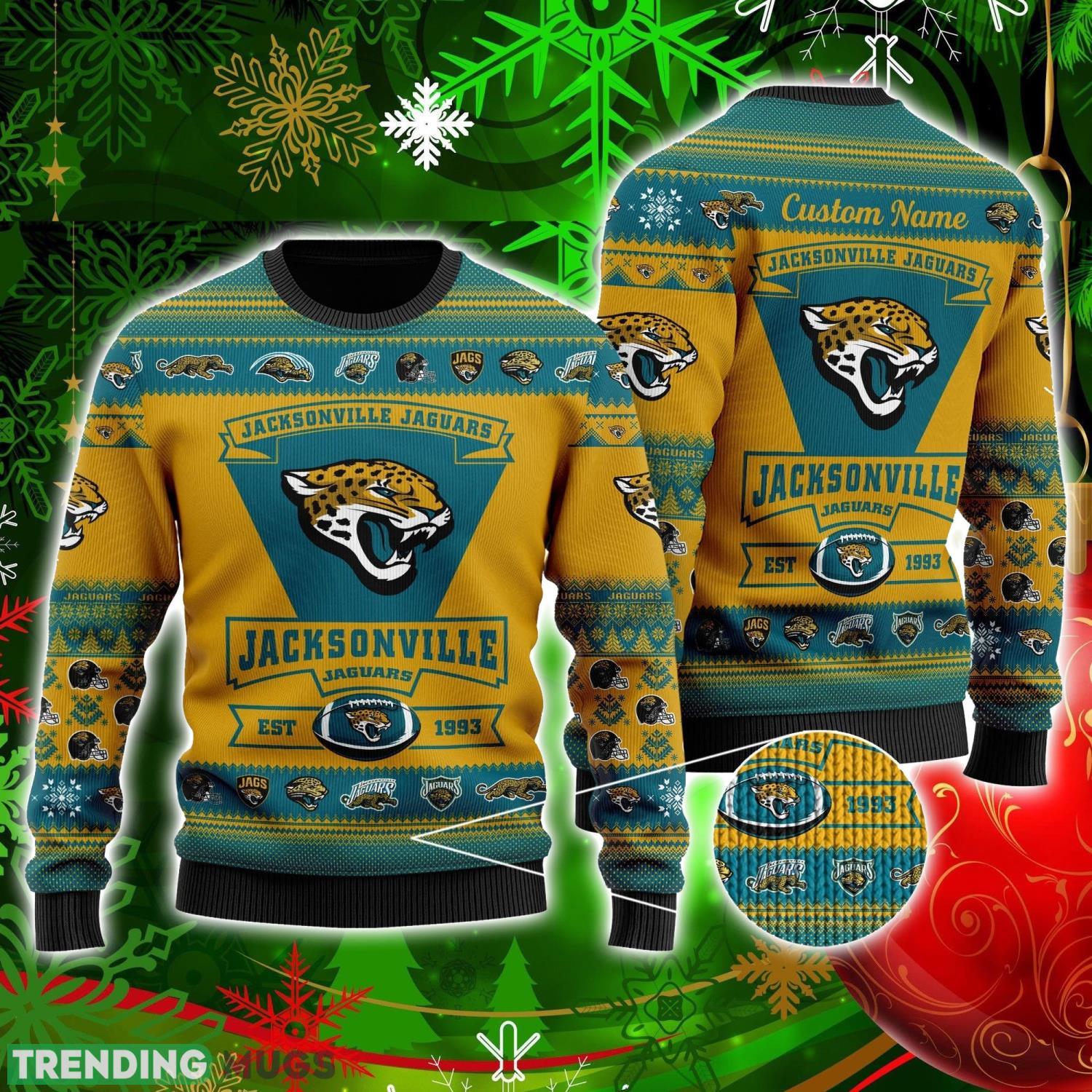 So, why wait? Show off your unwavering support for the Jacksonville Jaguars in a festive and personalized way with the Football Team Logo Personalized Ugly Christmas Sweater. Hurry and grab yours now before they’re gone!