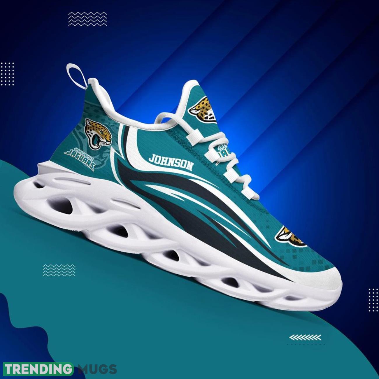This Jacksonville Jaguars NFL Max Soul Shoes Custom Name Sneakers Men Women Fans is a breathable, lightweight, and comfortable casual outdoor shoe that has a unique design. It is made of a mesh fabric which makes it sweat absorbent and breathable, while the rubber bottom ensures traction, comfort, and durability. It is available in two colors: black or white sole. There are two styles of shoelace holes so you can choose your preference.
