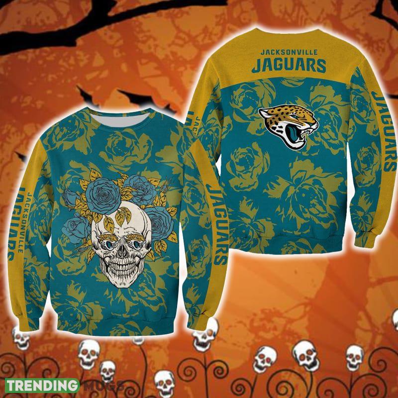 With its striking design, featuring a bold skull and rose pattern adorned with Jacksonville Jaguars logos, this sweater is sure to turn heads at any festive gathering. The combination of the team’s iconic symbols and the Halloween-inspired design makes it a must-have for any Jaguars fan looking to add a touch of spooky style to their wardrobe.