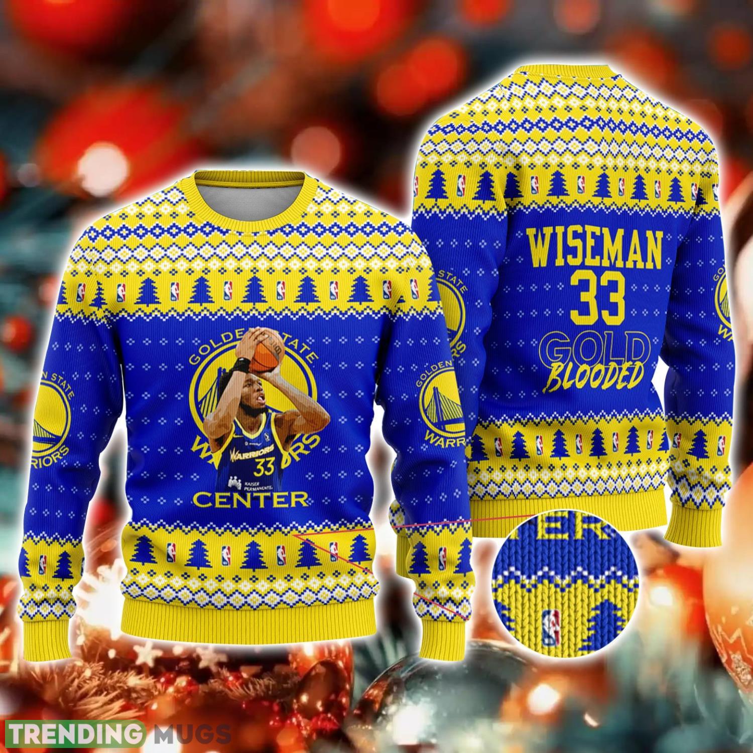 Crafted with utmost care, this sweater showcases James Wiseman’s name and the iconic Golden States Warriors logo, making it a must-have for any true fan. The rich gold color adds a touch of elegance, while the whimsical Christmas elements bring a playful twist to your wardrobe.