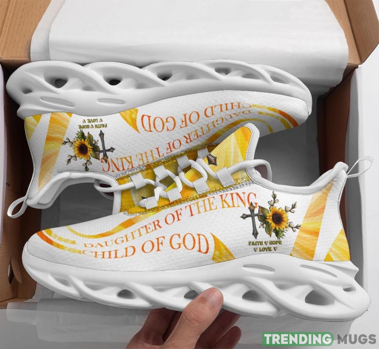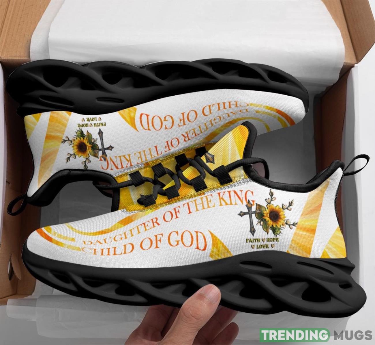 This Jesus Daughter Of The King White Yellow Max Soul Shoes Running Sneakers Sport Sneakers Gift is a breathable, lightweight, and comfortable casual outdoor shoe that has a unique design. It is made of a mesh fabric which makes it sweat absorbent and breathable, while the rubber bottom ensures traction, comfort, and durability. It is available in two colors: black or white sole. There are two styles of shoelace holes so you can choose your preference.