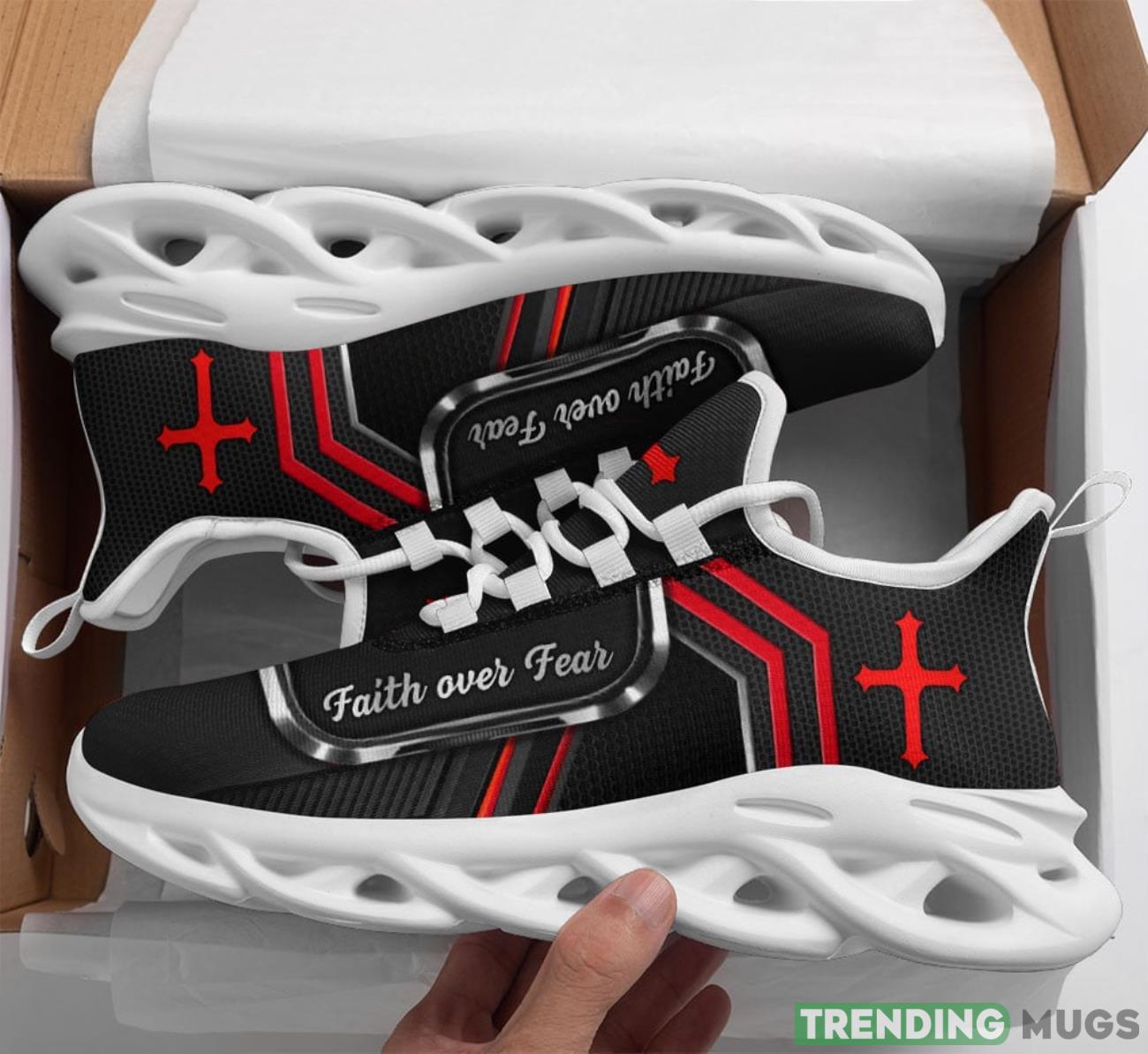 But these shoes are more than just a fashion statement. They carry a powerful message of unwavering faith and the ability to conquer any fear that comes your way. The bold and inspiring “Faith Over Fear” slogan prominently displayed on the shoes serves as a constant reminder to keep pushing forward and trust in a higher power.