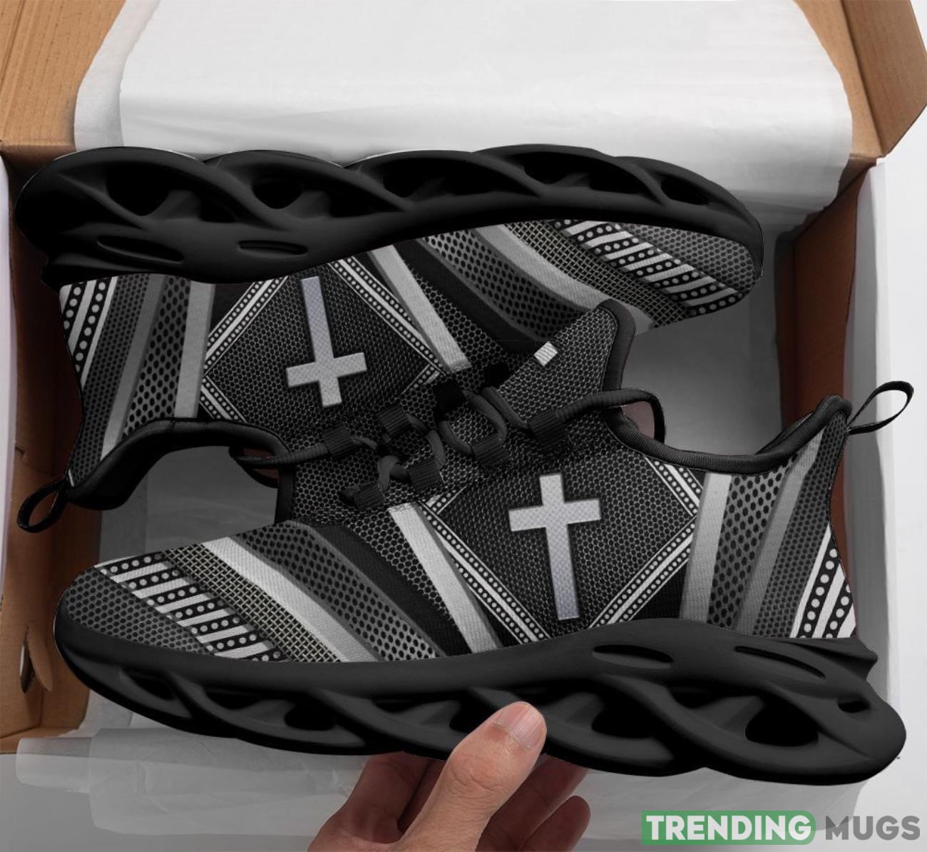 This Jesus Metal Cross Max Soul Shoes Running Sneakers Sport Sneakers Gift is a breathable, lightweight, and comfortable casual outdoor shoe that has a unique design. It is made of a mesh fabric which makes it sweat absorbent and breathable, while the rubber bottom ensures traction, comfort, and durability. It is available in two colors: black or white sole. There are two styles of shoelace holes so you can choose your preference.