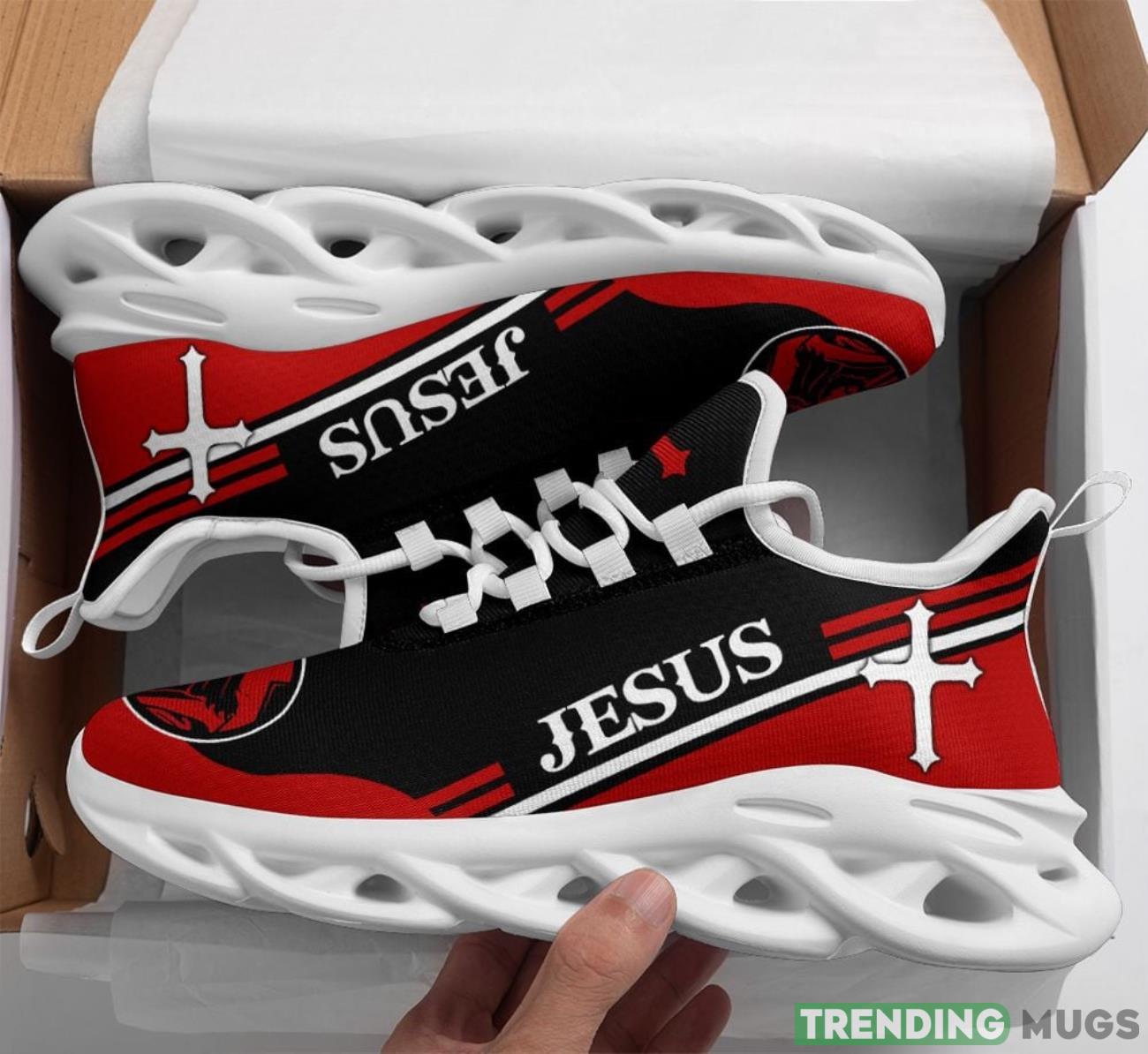 Crafted with a vibrant red and black colorway, these sneakers are sure to turn heads wherever you go. The bold design features the iconic image of Jesus, reminding you to stay grounded in your beliefs as you conquer every mile. Whether you’re hitting the gym, going for a jog, or simply running errands, these shoes will provide you with the utmost comfort and support.