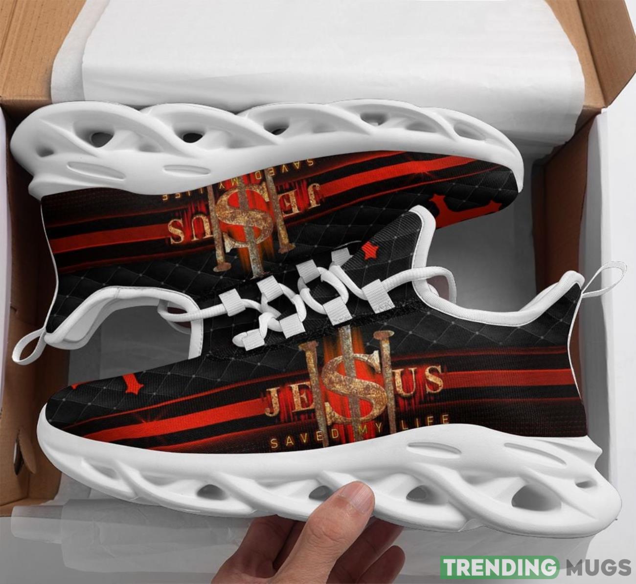 This Jesus Saved My Life Max Soul Shoes Running Sneakers Sport Sneakers Gift is a breathable, lightweight, and comfortable casual outdoor shoe that has a unique design. It is made of a mesh fabric which makes it sweat absorbent and breathable, while the rubber bottom ensures traction, comfort, and durability. It is available in two colors: black or white sole. There are two styles of shoelace holes so you can choose your preference.