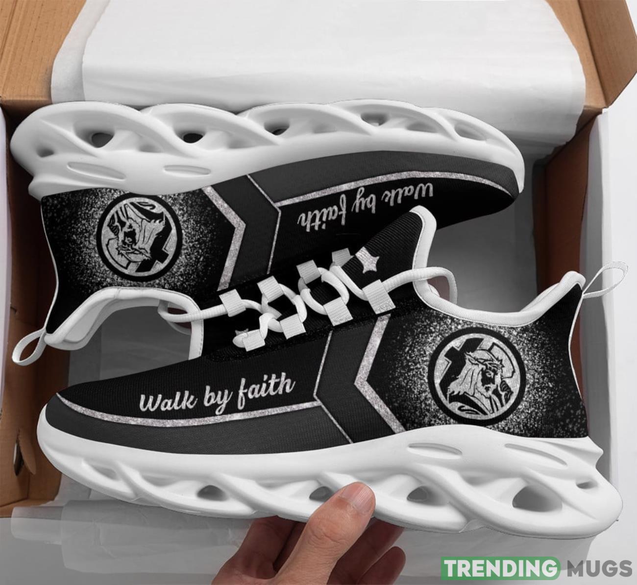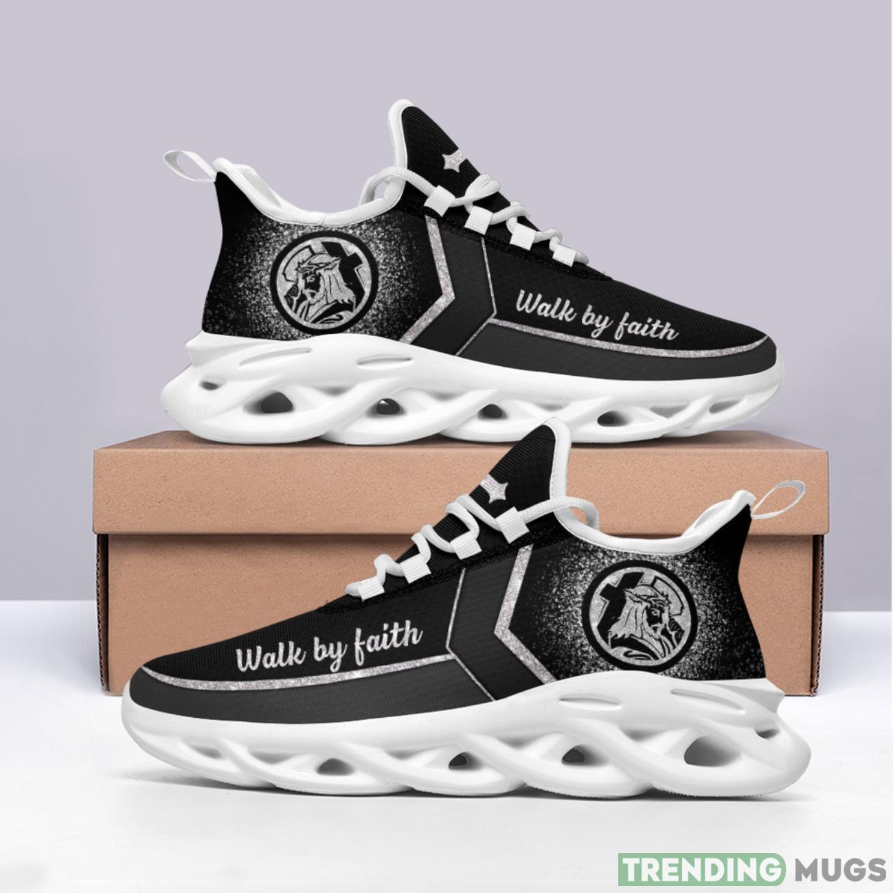 This Jesus Walk By Faith Max Soul Shoes Running Sneakers Sport Sneakers Gift Big Fans Gift is a breathable, lightweight, and comfortable casual outdoor shoe that has a unique design. It is made of a mesh fabric which makes it sweat absorbent and breathable, while the rubber bottom ensures traction, comfort, and durability. It is available in two colors: black or white sole. There are two styles of shoelace holes so you can choose your preference.