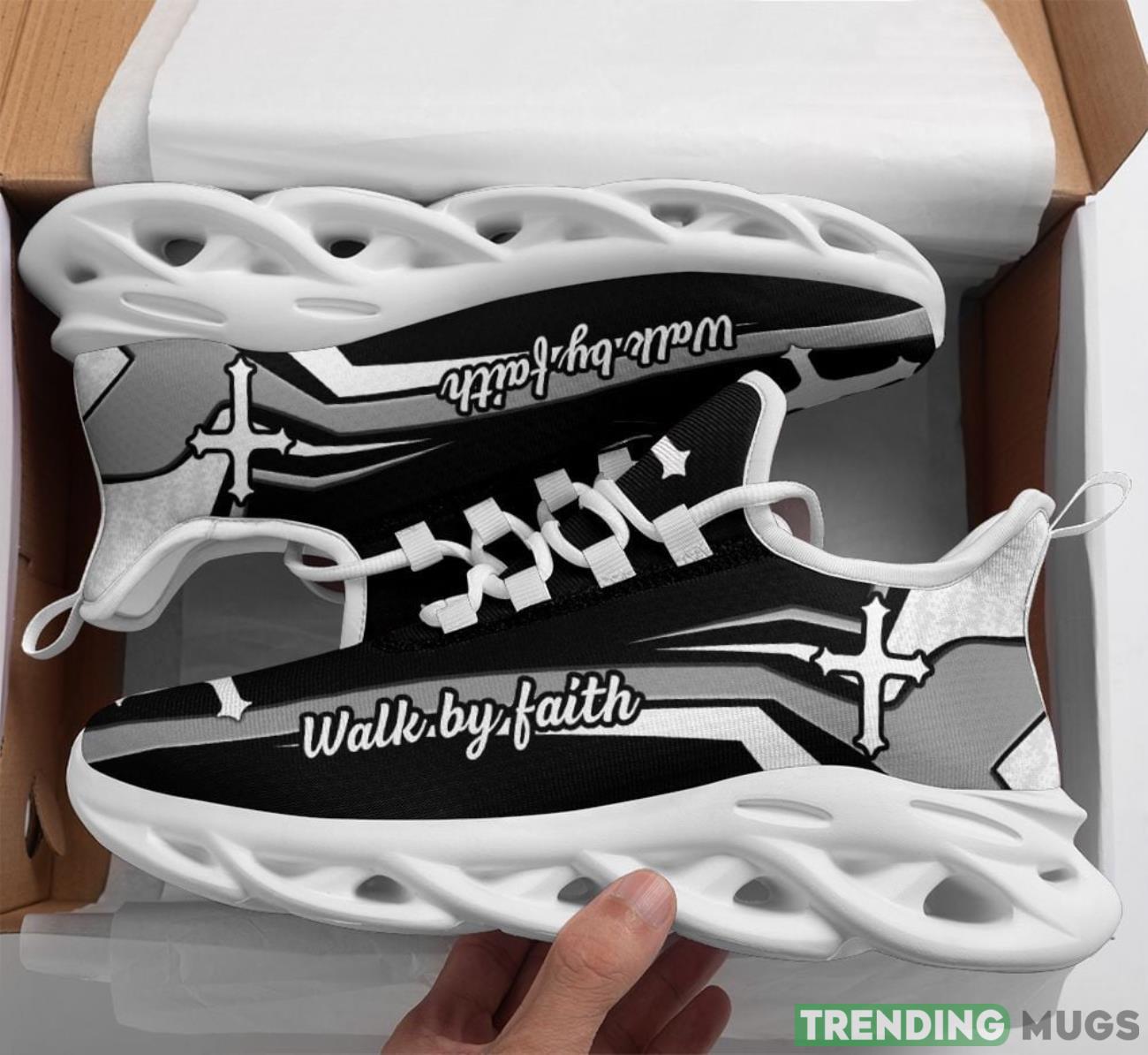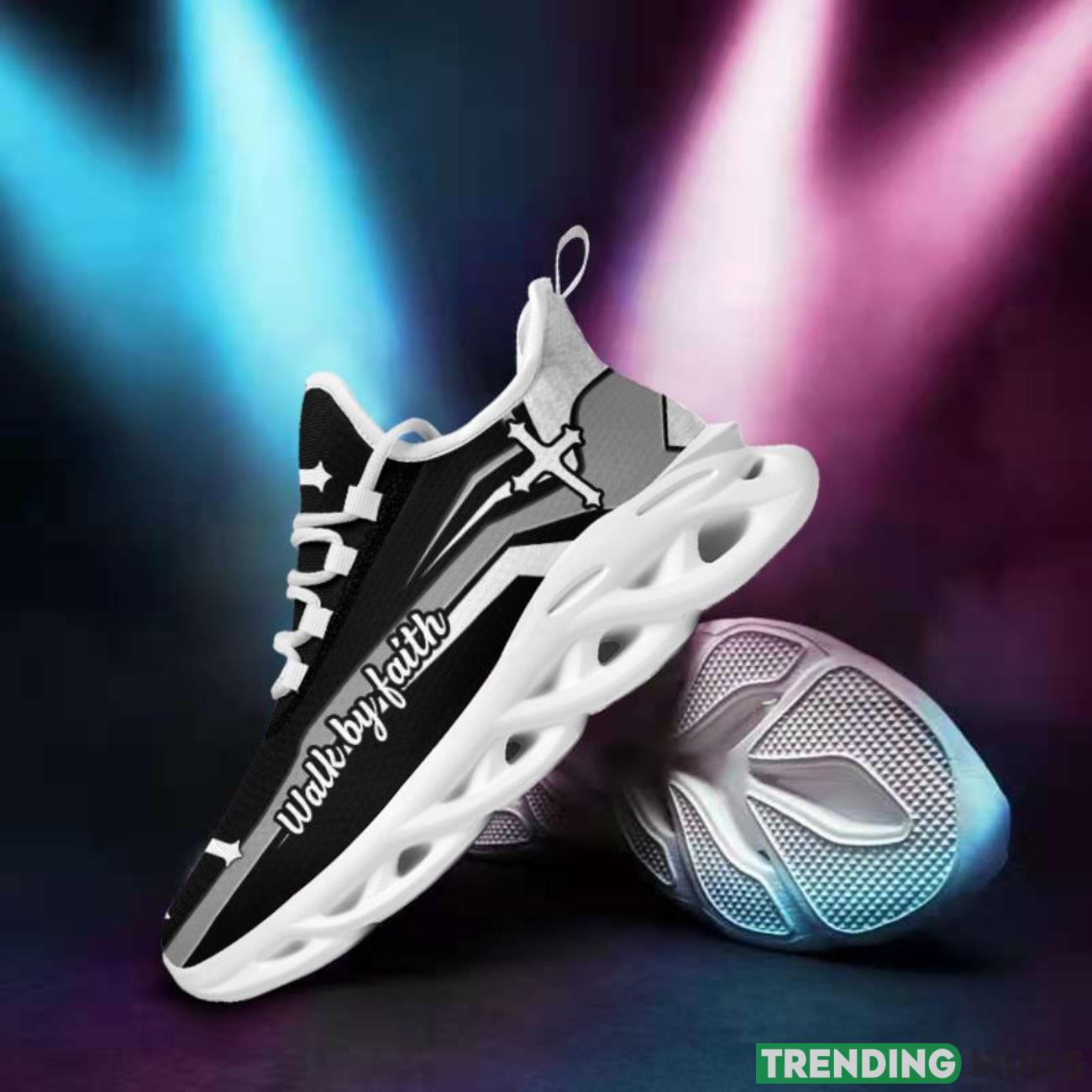 This Jesus Walk By Faith Max Soul Shoes Running Sneakers Sport Sneakers Gift Black White is a breathable, lightweight, and comfortable casual outdoor shoe that has a unique design. It is made of a mesh fabric which makes it sweat absorbent and breathable, while the rubber bottom ensures traction, comfort, and durability. It is available in two colors: black or white sole. There are two styles of shoelace holes so you can choose your preference.