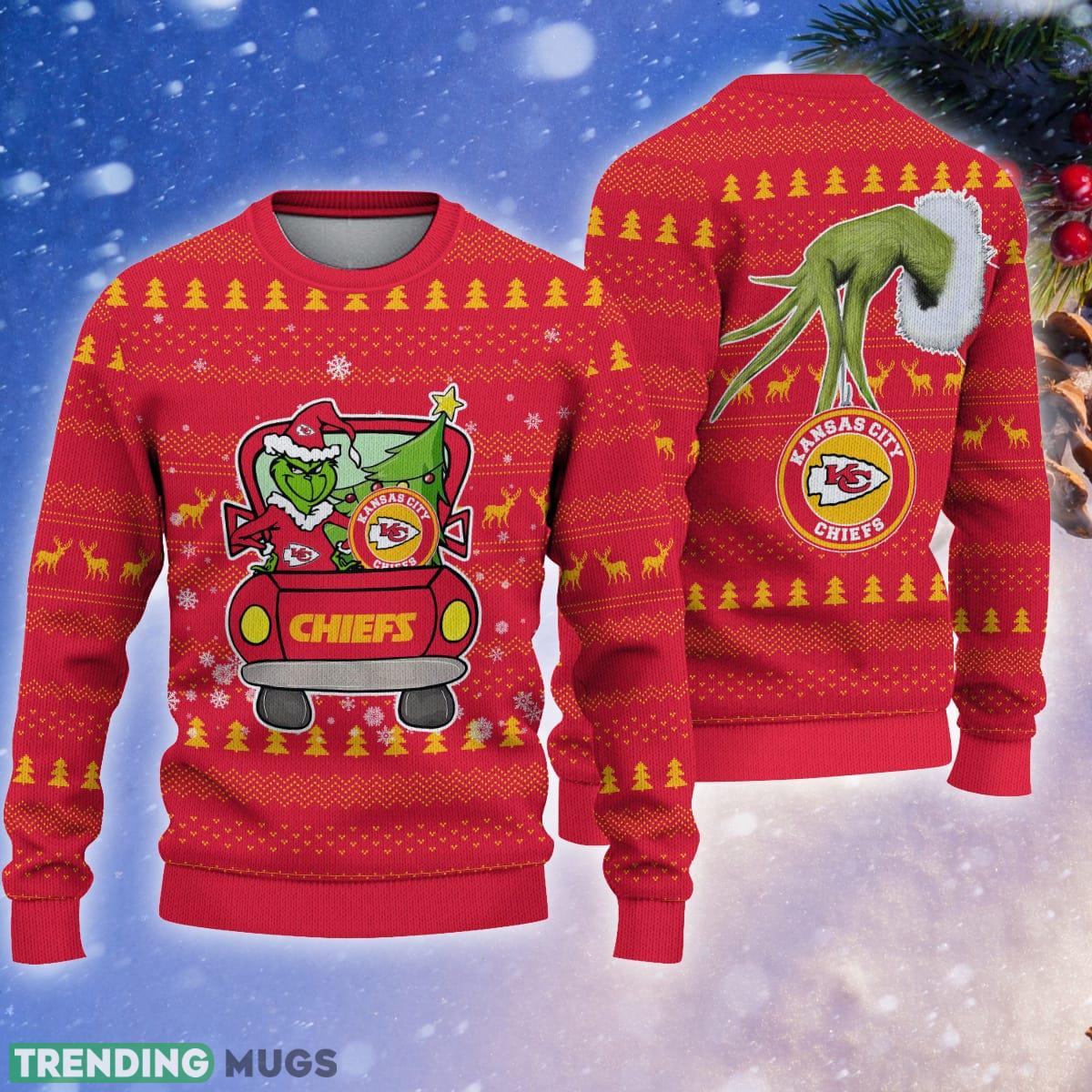 Kansas City Chiefs And Grinch Driving With Pine Trees Knitted Christmas Sweater Holidays Gift