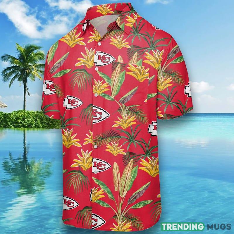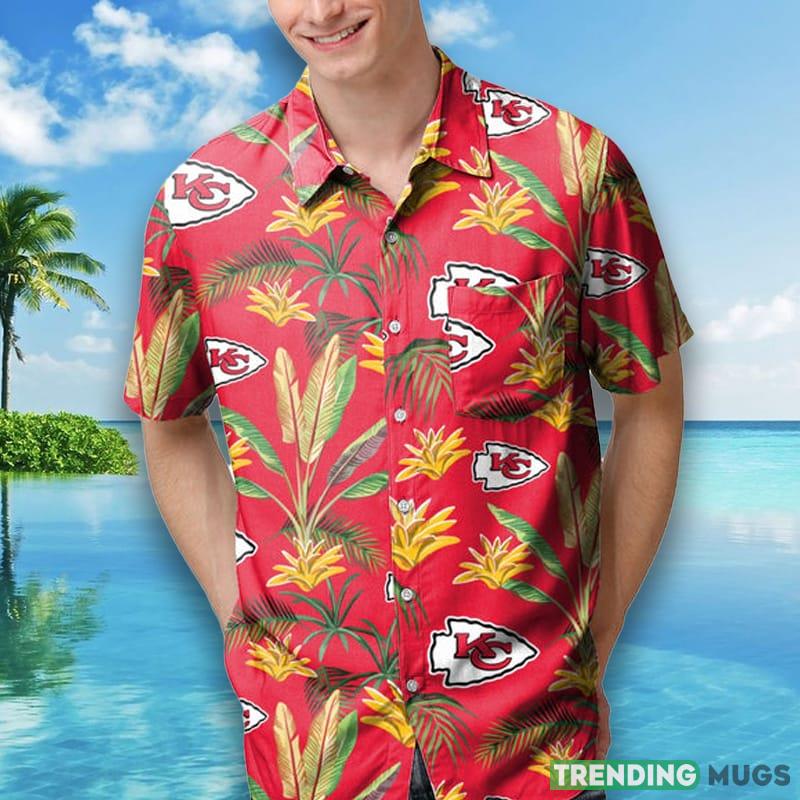 Featuring the iconic red and yellow colors of the Kansas City Chiefs, this shirt is adorned with a vibrant floral print that exudes tropical vibes. The shirt also includes the Kansas City Chiefs logo on the front, proudly displaying your team spirit. The button-up design and classic collar make this shirt versatile and easy to style with any outfit.