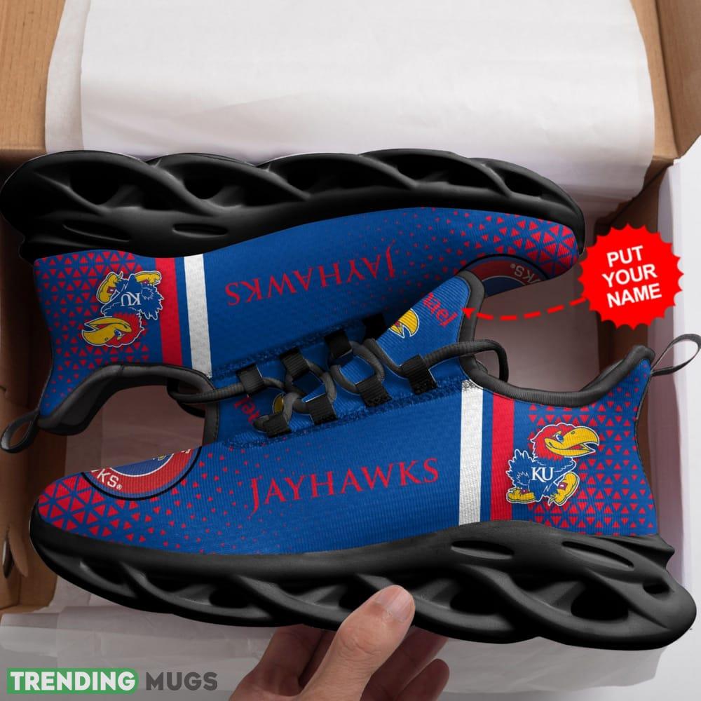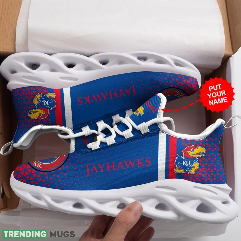 Introducing our Kansas Jayhawks Logo Triangle Pattern Custom Name 3D Max Soul Sneaker Shoes in Blue and Red! Elevate your sneaker game to new heights with these eye-catching kicks. Designed with utmost attention to detail, these shoes showcase a mesmerizing triangle pattern featuring the iconic Kansas Jayhawks logo.