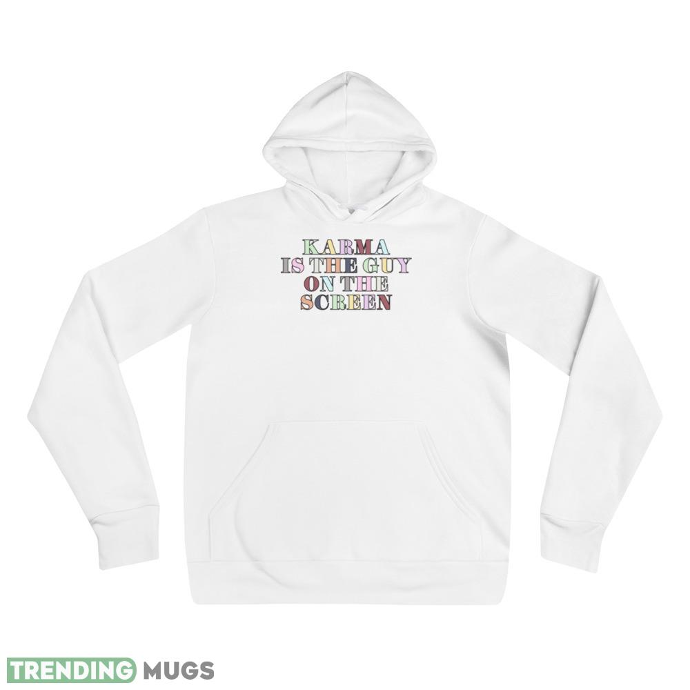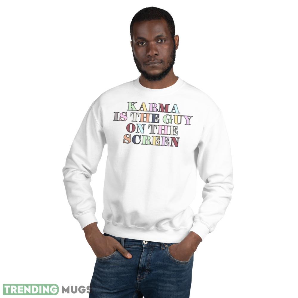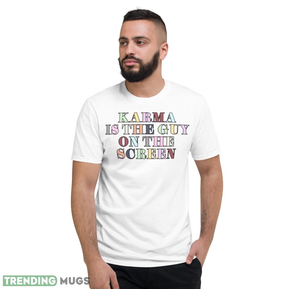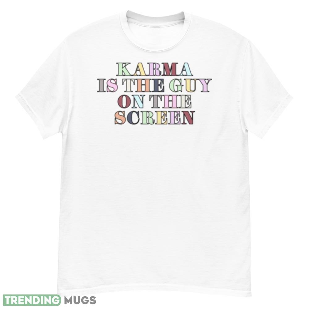 With its bold and eye-catching design, this shirt is perfect for anyone who wants to stand out from the crowd. Featuring the iconic image of Taylor Swift on the screen, surrounded by the words “Karma Is The Guy”, this shirt is sure to turn heads wherever you go.