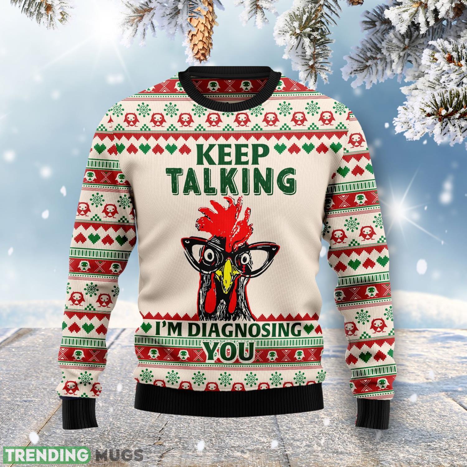 Crafted with meticulous attention to detail, our sweater features a vibrant design that showcases your love for chickens, while adding a touch of holiday magic. The bold text, “Keep Talking I’m Diagnosing You,” adds a playful twist, guaranteeing smiles and laughter wherever you go.