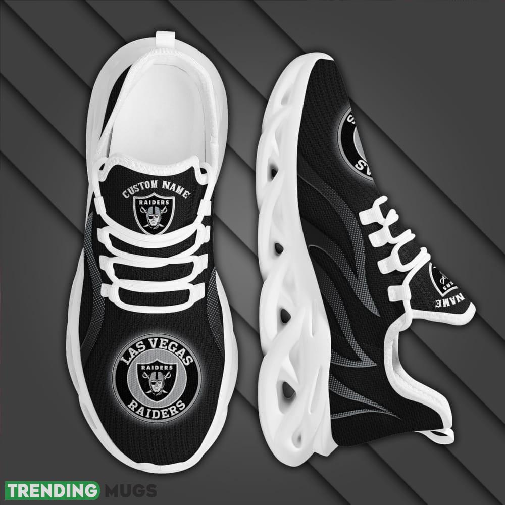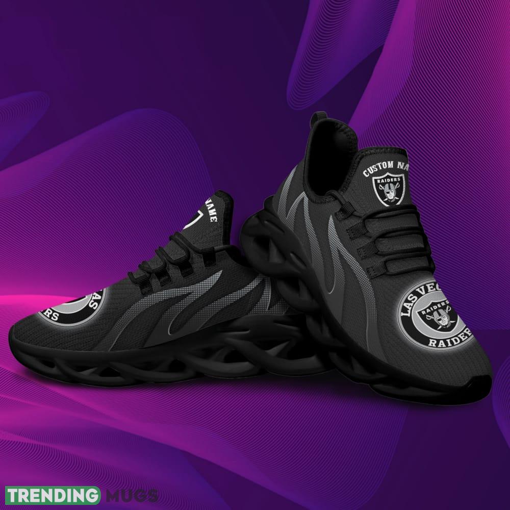 Stand out from the crowd and let your feet do the talking with our Las Vegas Raiders Logo Custom Name Pattern In Black 3D Max Soul Sneaker Shoes. Order yours today and step into a world of team pride and fashion-forward style.