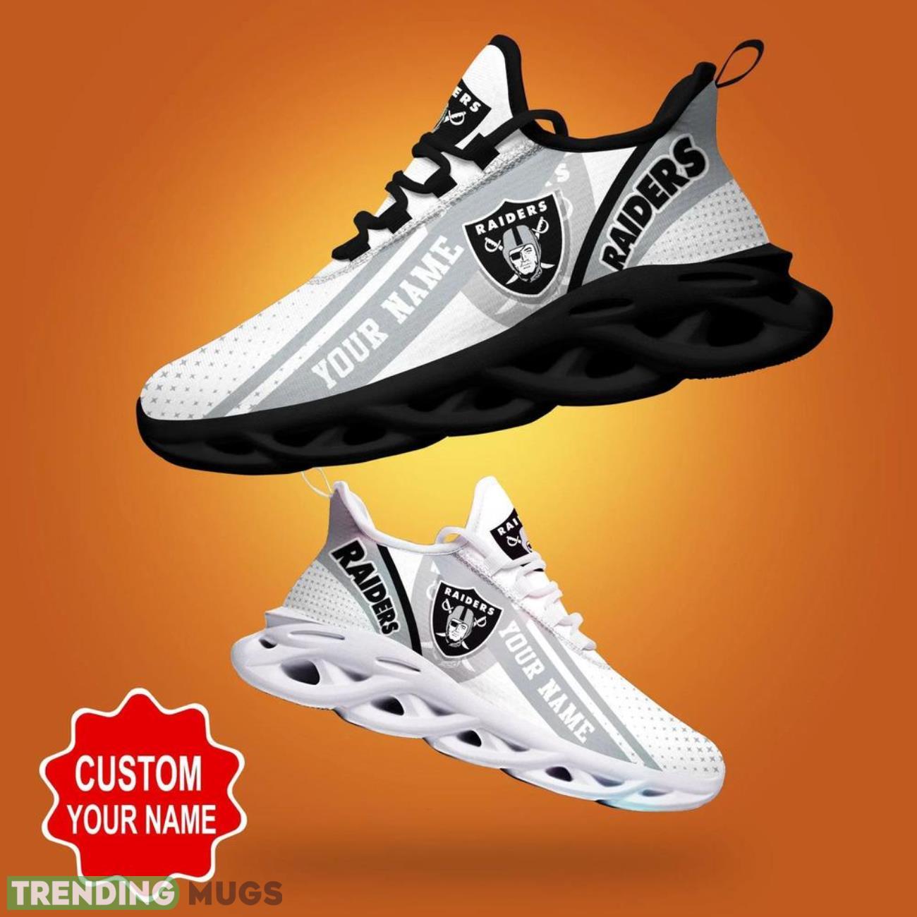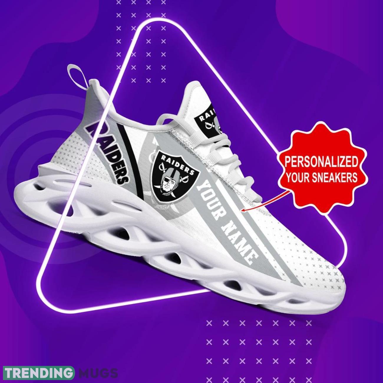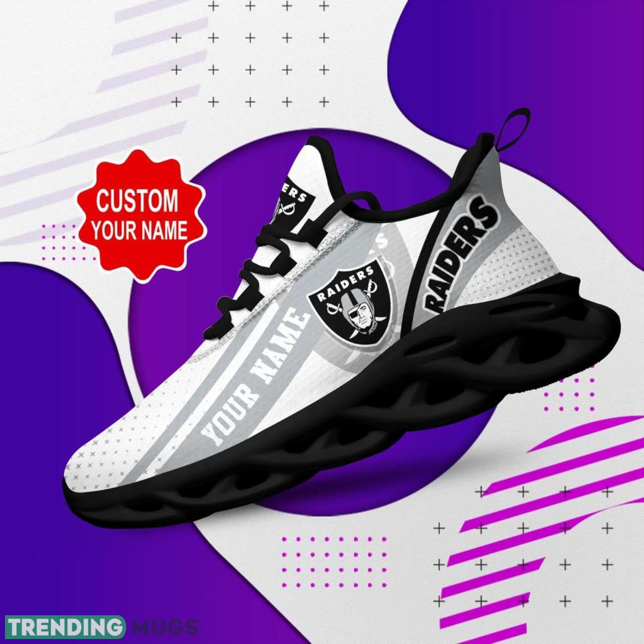 This Las Vegas Raiders NFL Max Soul Shoes Custom Name Sneakers Gifts Footall Men Women Shoes is a breathable, lightweight, and comfortable casual outdoor shoe that has a unique design. It is made of a mesh fabric which makes it sweat absorbent and breathable, while the rubber bottom ensures traction, comfort, and durability. It is available in two colors: black or white sole. There are two styles of shoelace holes so you can choose your preference.