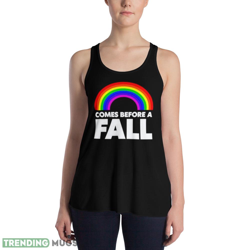 The graphic on the shirt features the phrase “Comes Before A Fall” in bold, capital letters, surrounded by intricate designs and patterns. The color scheme is a stunning combination of black and white, with hints of gray and silver. This creates a sleek and sophisticated look that is sure to make a statement.