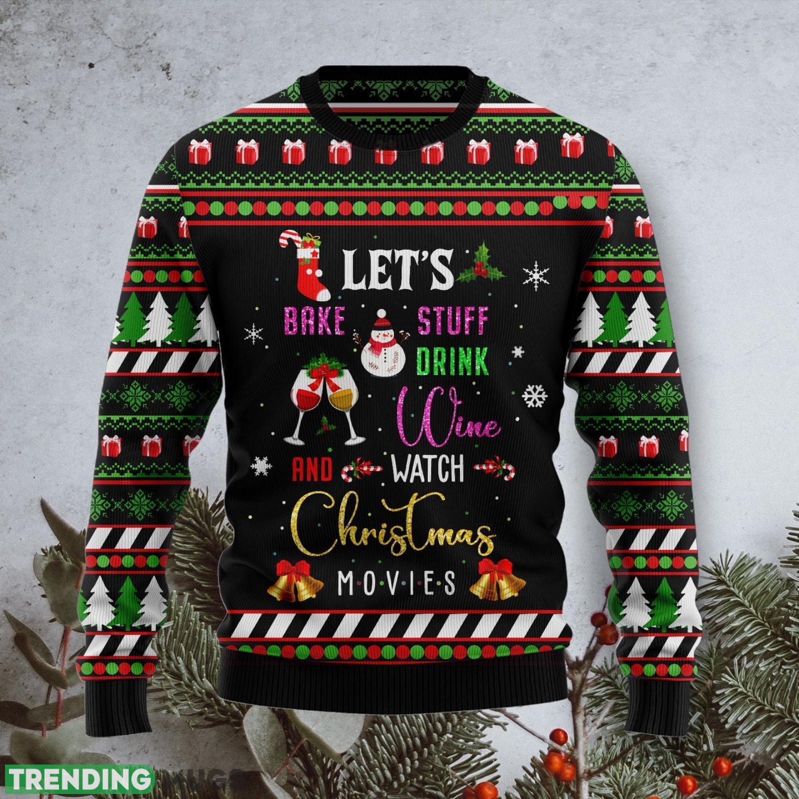 Spread the holiday cheer and be the life of the party with our Let’s Bake Stuff Drink Wine And Watch Christmas Movie Ugly Christmas Sweater. It’s a unique Christmas gift that will bring a smile to anyone’s face. So why wait? Grab yours today and get ready to celebrate the most wonderful time of the year in style!