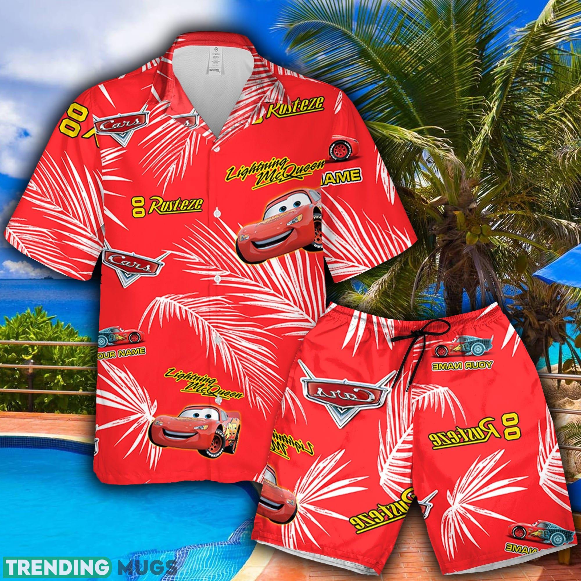 Some of the Lightning Mcqueen Red Black White Hawaiian Shirt And Short Palm Leaves Custom Name Summer Gift For Men And Women photos