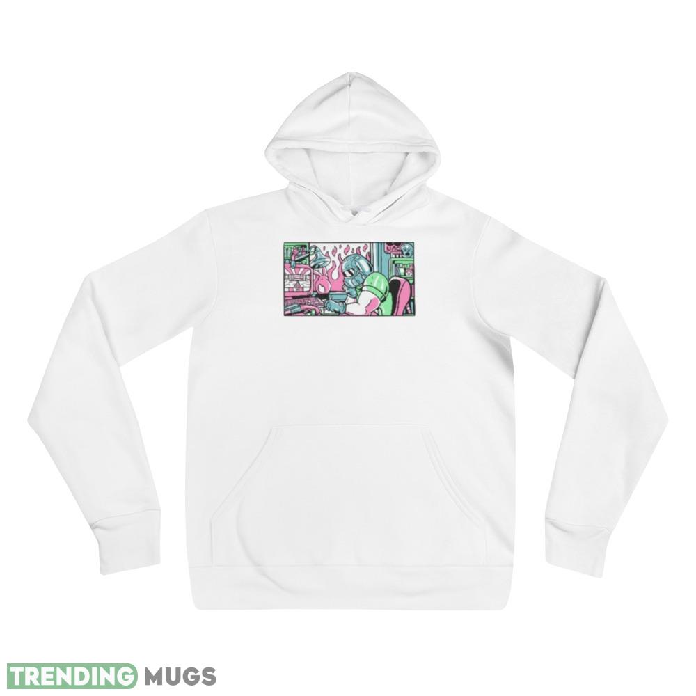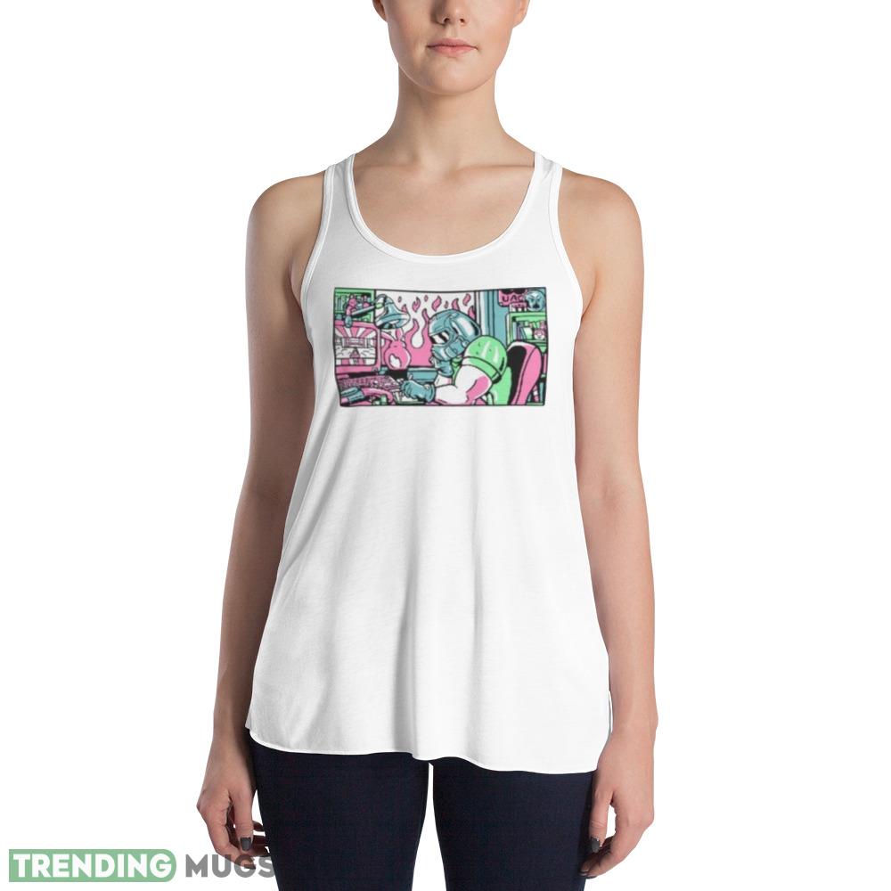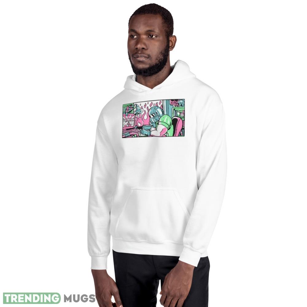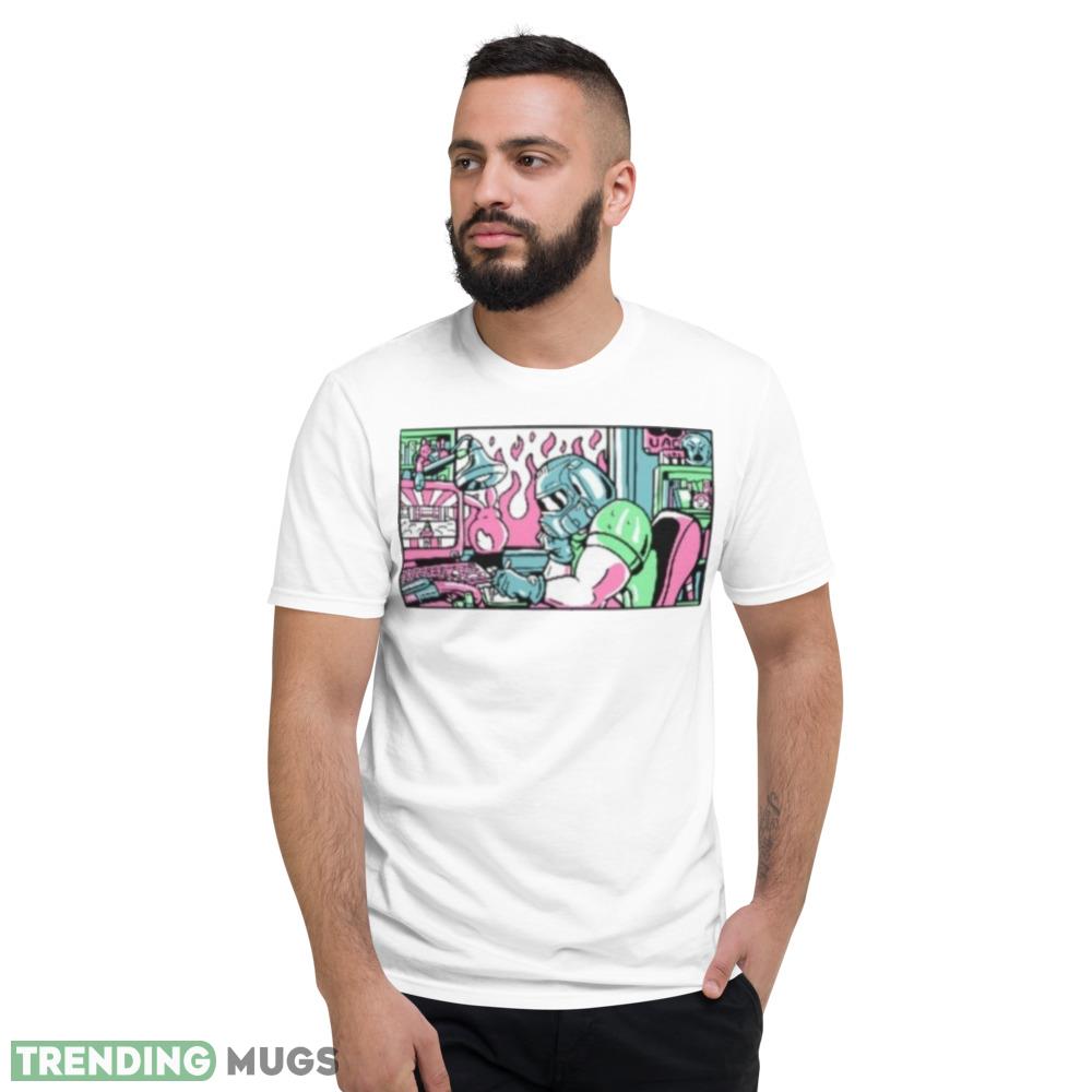 The Lofi Rip & Tear Radio Doom 80s Anime Metal Face shirt features a striking image of a metal face blended with anime-style graphics that are sure to grab attention. The color palette is a mix of black, white, and grey, which makes it easy to style and match with any outfit.