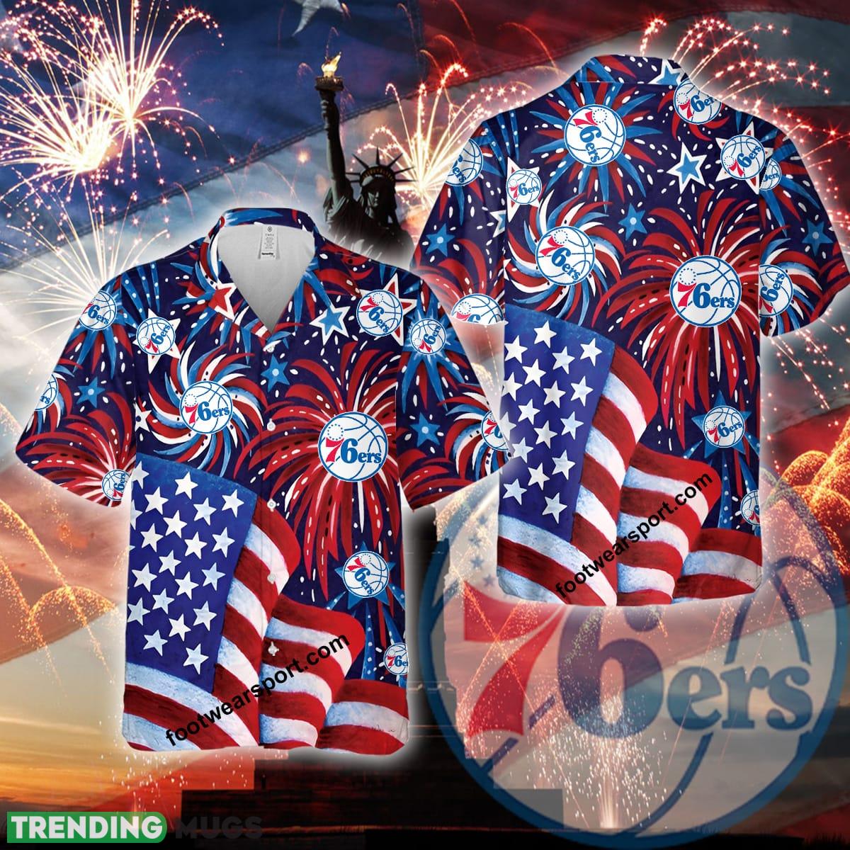 Logo NBA Philadelphia 76ers US Flag Pattern Firework Memory copy Hawaiian Shirt Gift Independence Day Details: