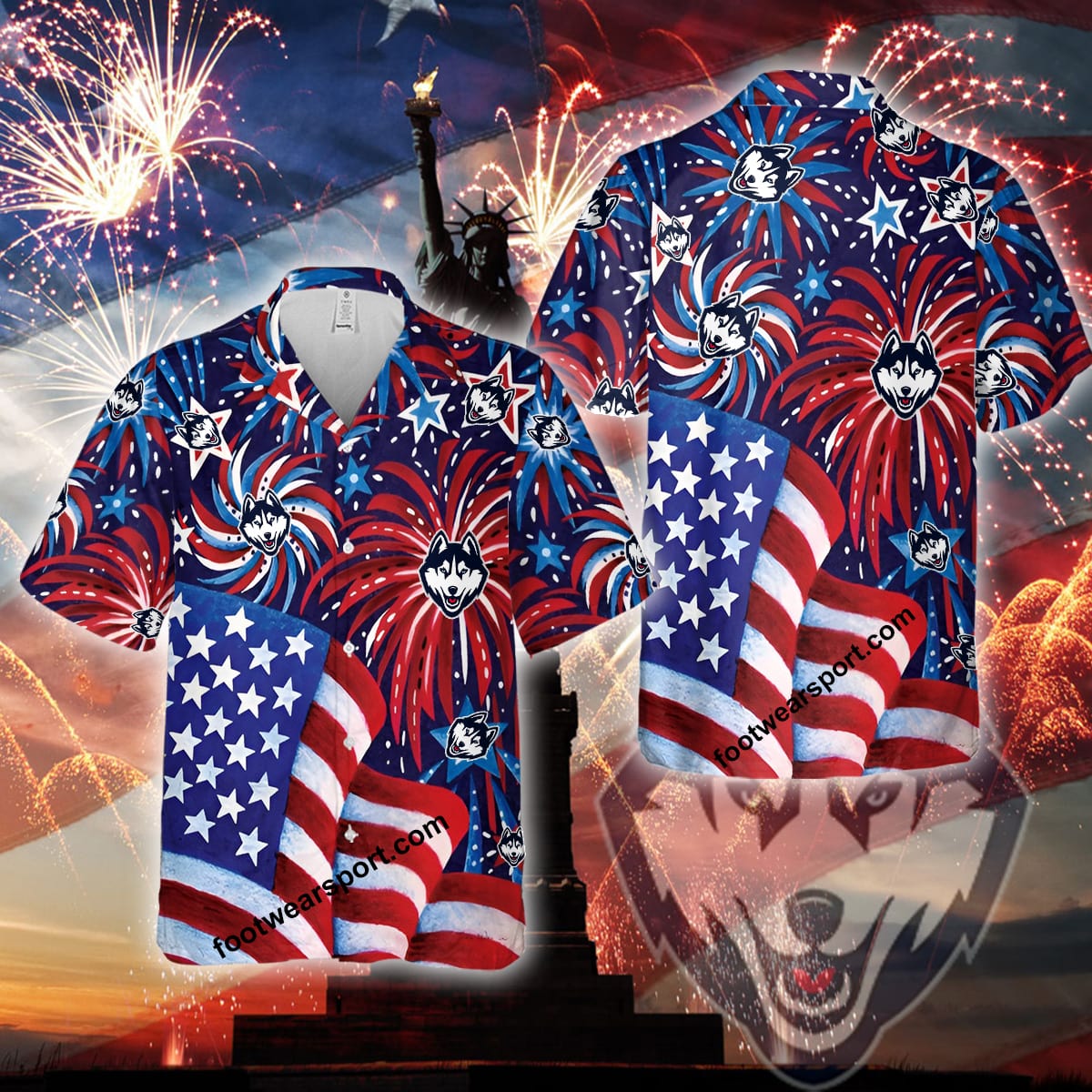Some of the Logo NCAA Connecticut Huskies US Flag Pattern Firework Memory copy Beach Hawaiian Shirt All Over Print Gift Independence Day photos