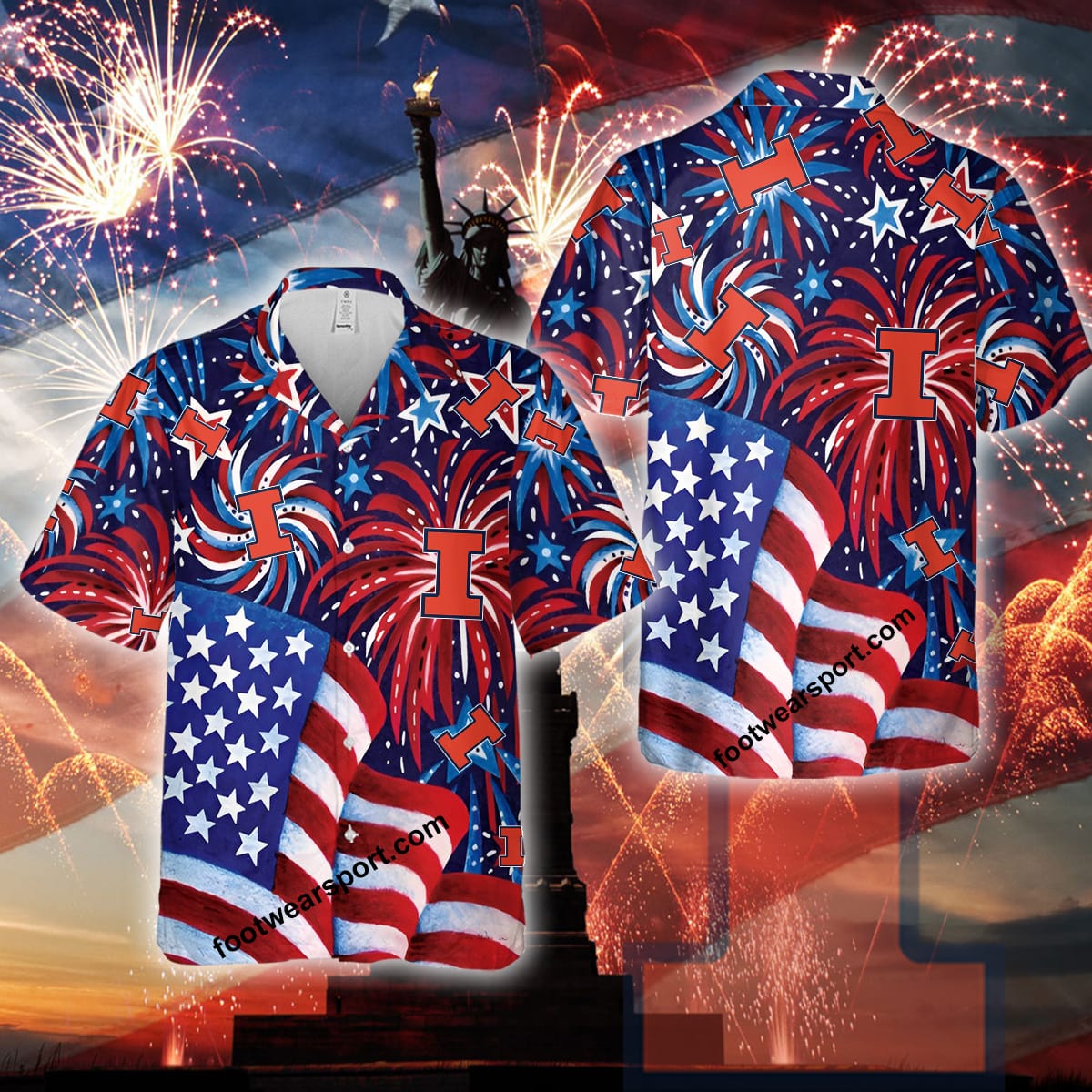 Logo NCAA Illinois Fighting Illini US Flag Pattern Firework Memory copy Beach Hawaiian Shirt AOP Gift Independence Day – 060524-120447