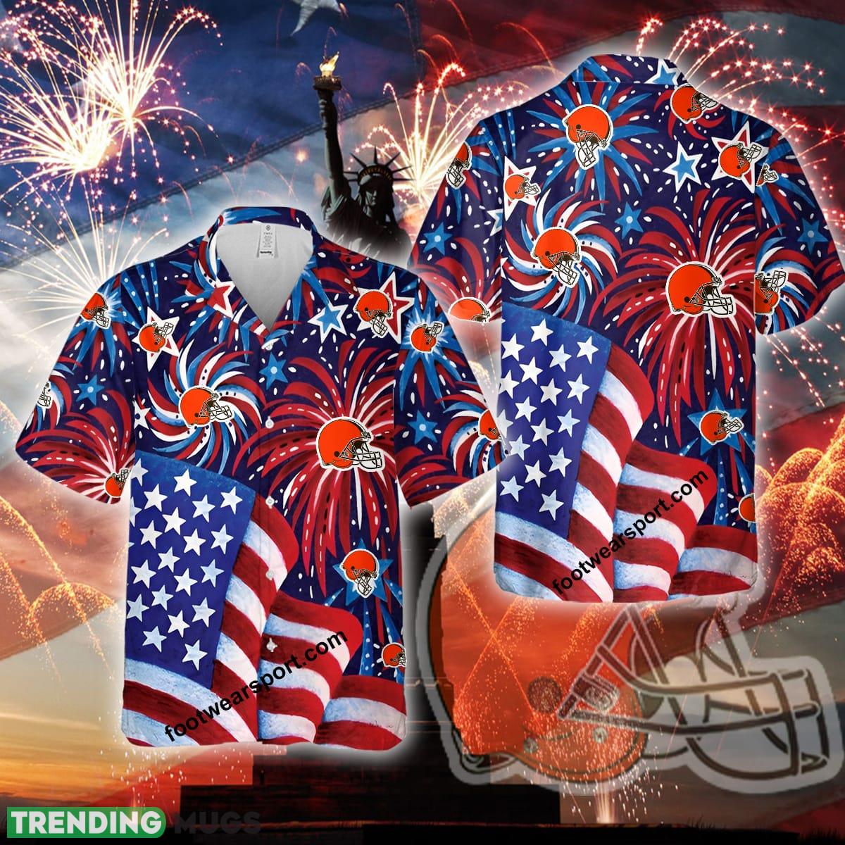 Logo NFL Cleveland Browns US Flag Pattern Firework Memory Men Women 3D Hawaiian Shirt Gift Independence Day Details: