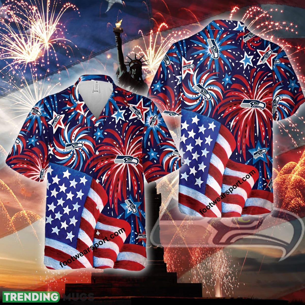 Logo NFL Seattle Seahawks US Flag Pattern Firework Memory Summer 3D Hawaiian Shirt Gift Independence Day