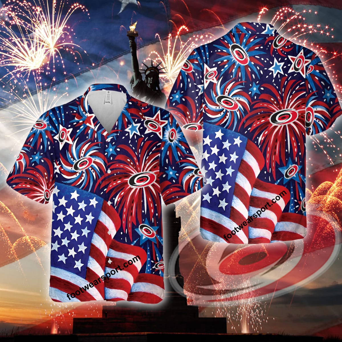 Logo NHL Carolina Hurricanes US Flag Pattern Firework Memory Men Women Hawaiian Shirt All Over Print Gift Independence Day Details:
