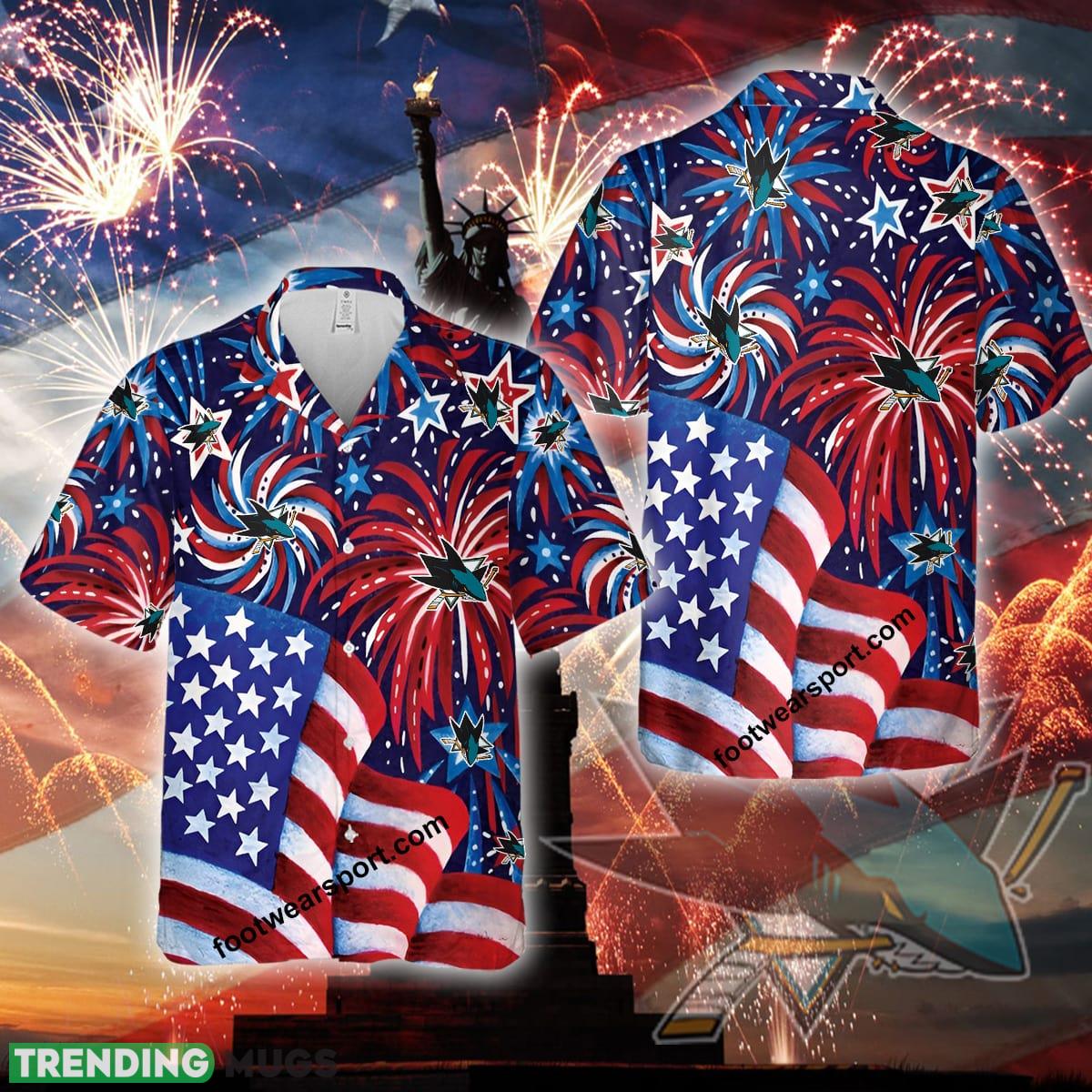 Logo NHL San Jose Sharks US Flag Pattern Firework Memory Fans Aloha Hawaiian Shirt Gift Independence Day Details: