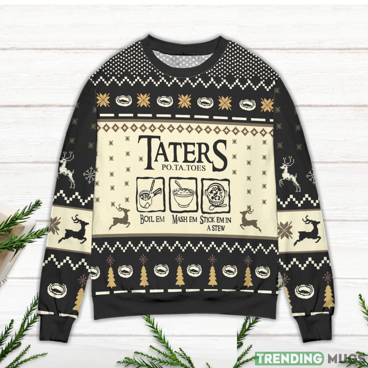Some of the Lord of The Rings Taters Potatoes Recipe Pine Tree & Reindeer Pattern Black Ugly Christmas Sweater photos