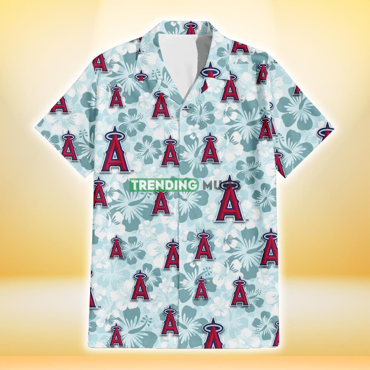 Some of the Los Angeles Angels Pale Turquoise Hibiscus Light Cyan Background 3D Hawaiian Shirt photos