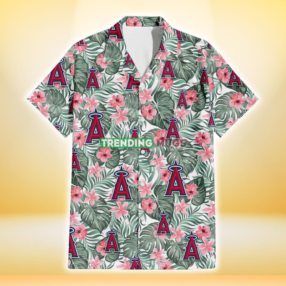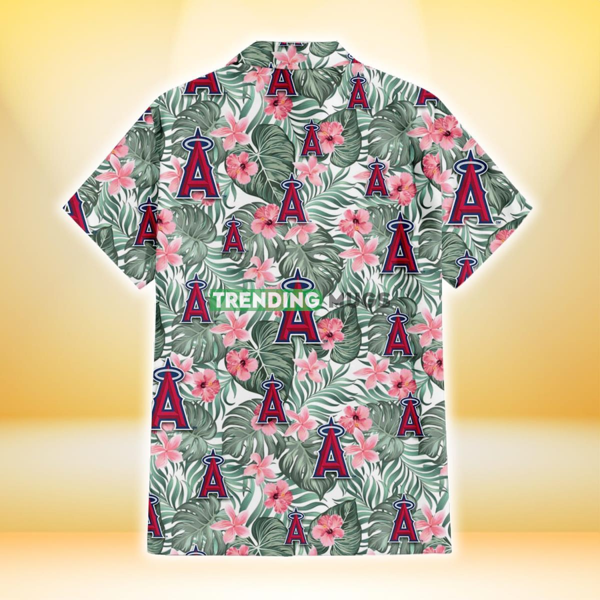 Los Angeles Angels Pink Hibiscus Porcelain Flower Tropical Leaf White Background 3D Hawaiian Shirt Details: