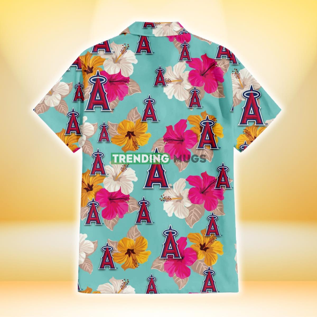 Some of the Los Angeles Angels Pink Yellow White Hibiscus Turquoise Background 3D Hawaiian Shirt photos