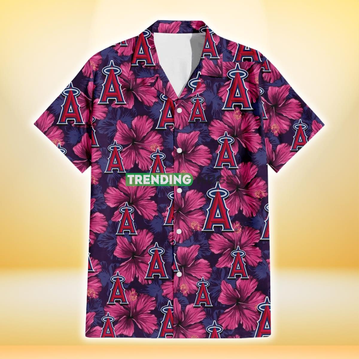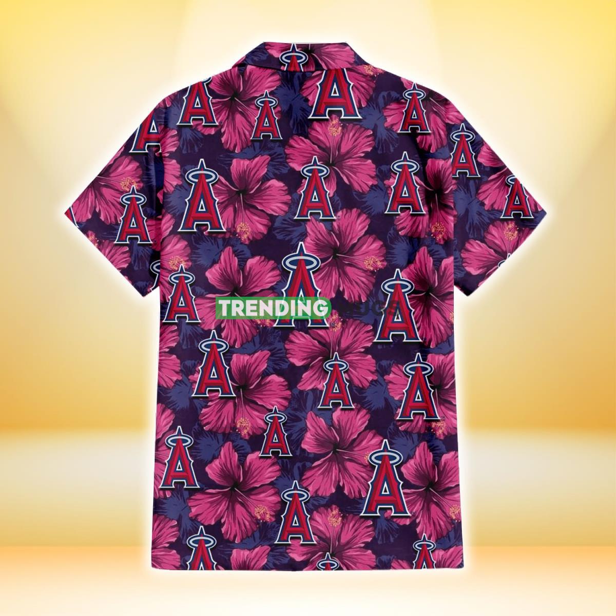 Some of the Los Angeles Angels Plum Vilolet Hibiscus Dark Navy Leaf Black 3D Hawaiian Shirt photos