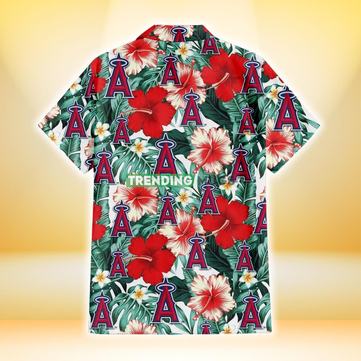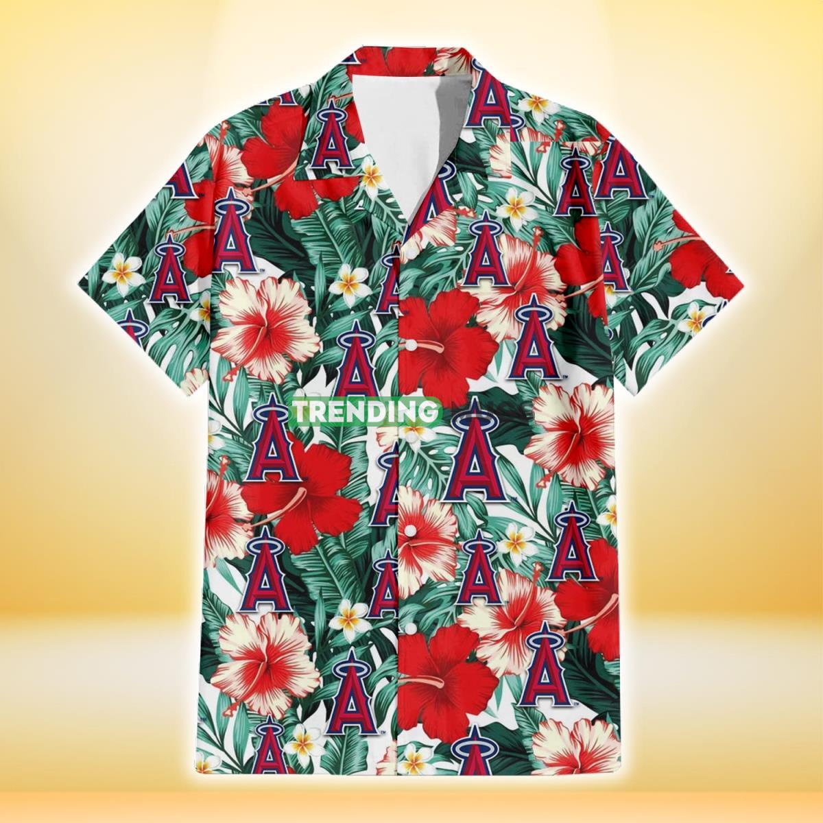 Los Angeles Angels Red Coral Hibiscus White Porcelain Flower Banana Leaf 3D Hawaiian Shirt Details: