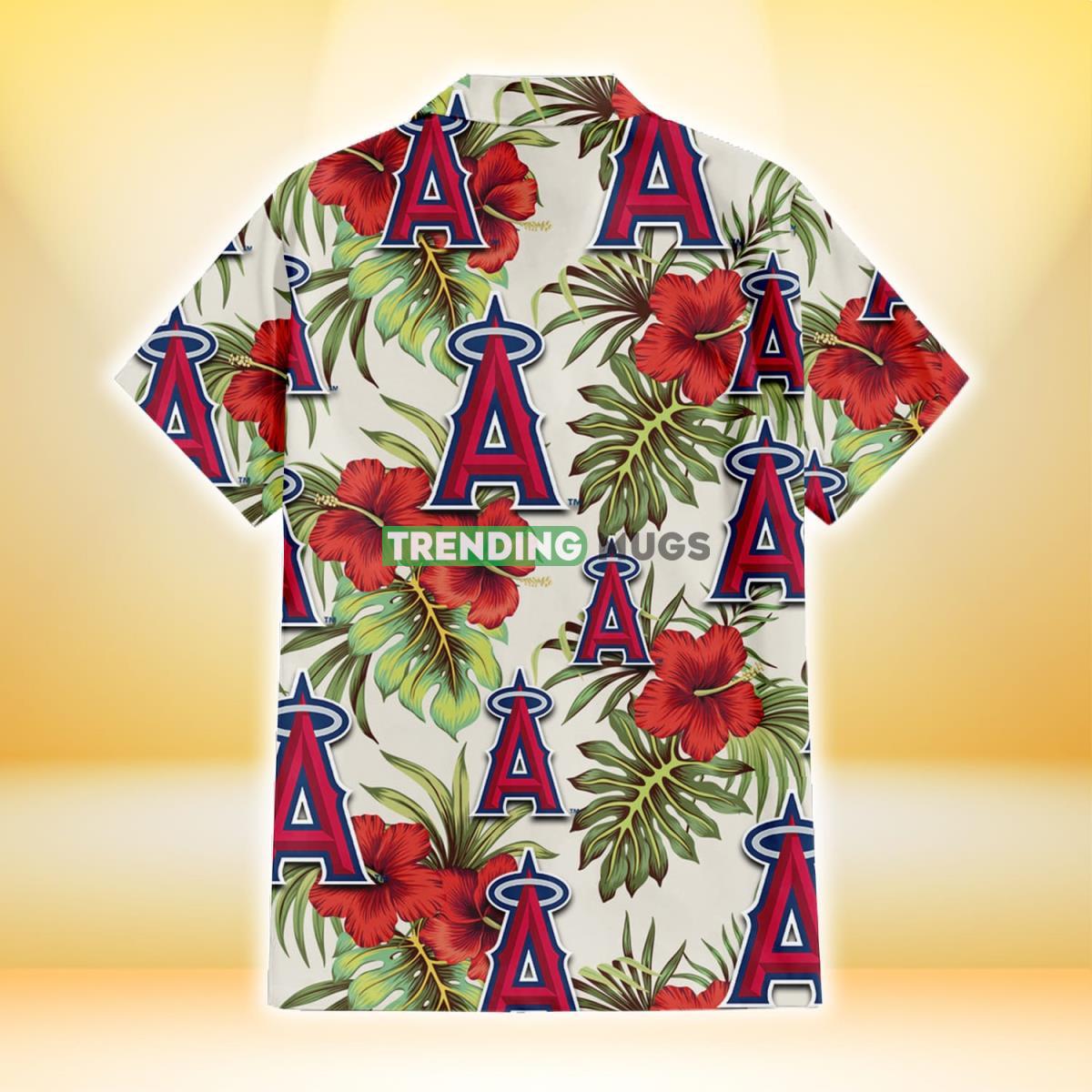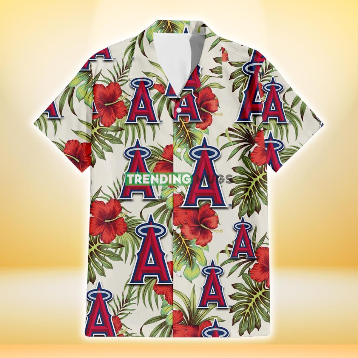 Some of the Los Angeles Angels Red Hibiscus Green Tropical Leaf Cream Background 3D Hawaiian Shirt photos