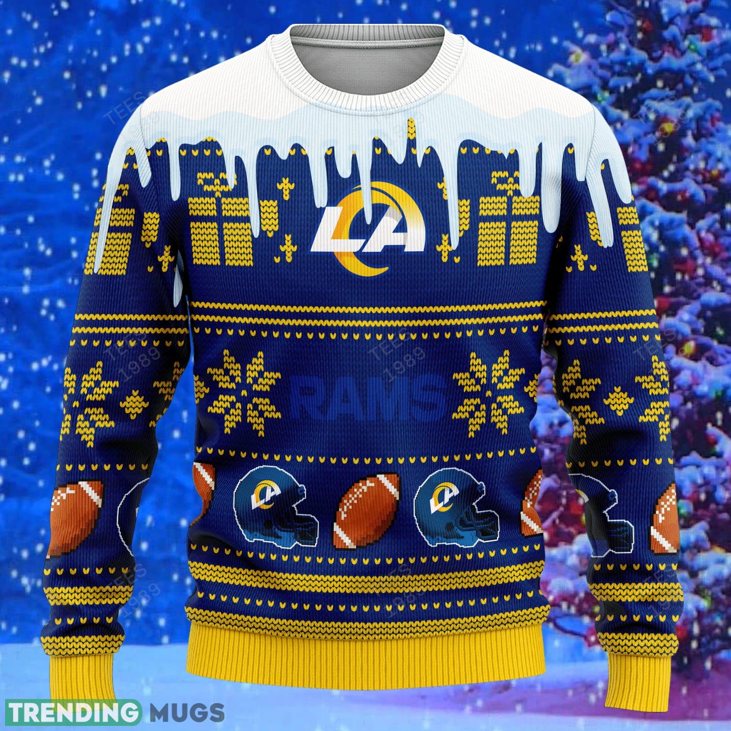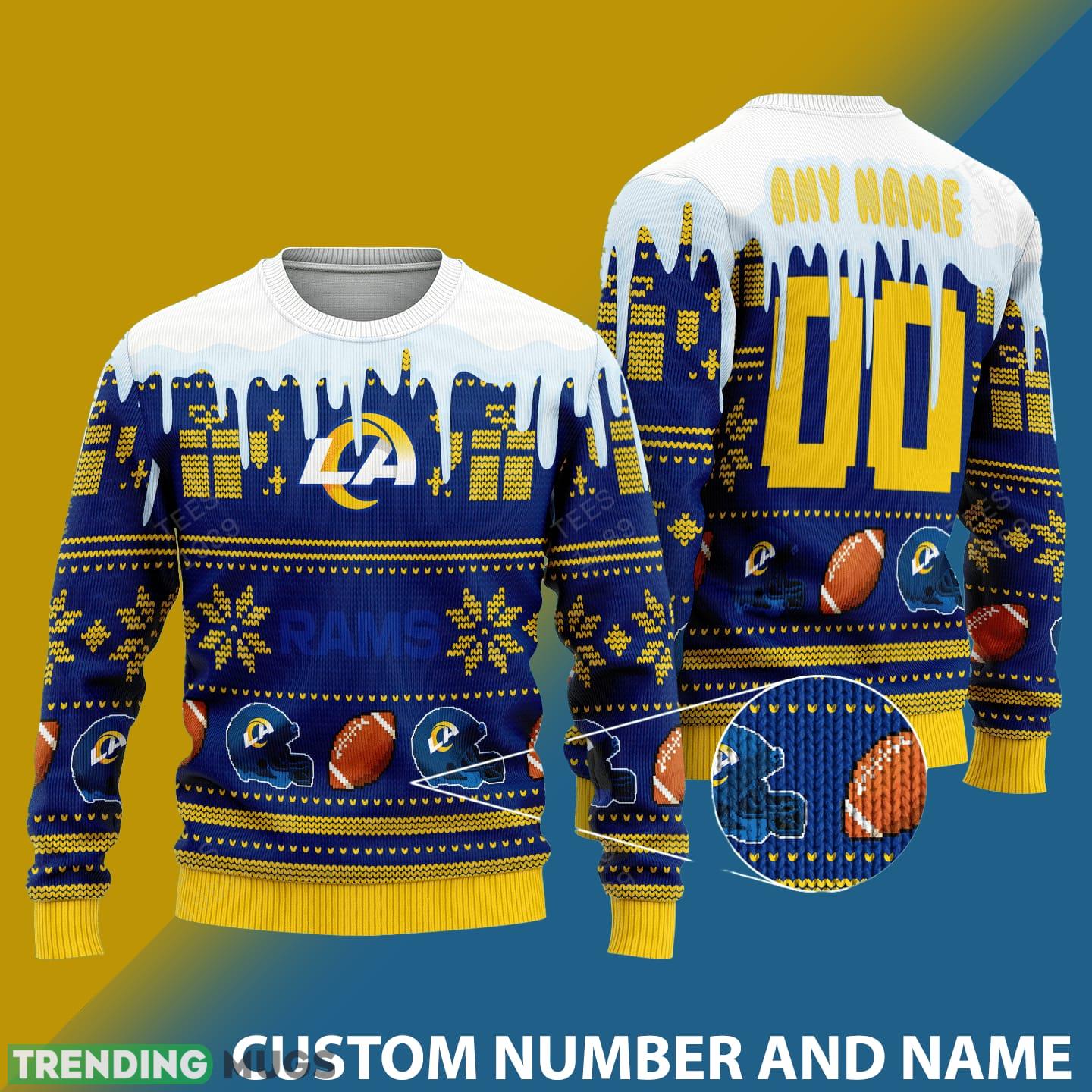 Featuring a stunning 3D design adorned with snowflakes and reindeer, this sweater will surely turn heads wherever you go. The Los Angeles Rams graphics proudly display your team loyalty, while the custom number and name option adds a personal touch that makes it truly one-of-a-kind.