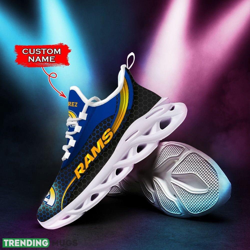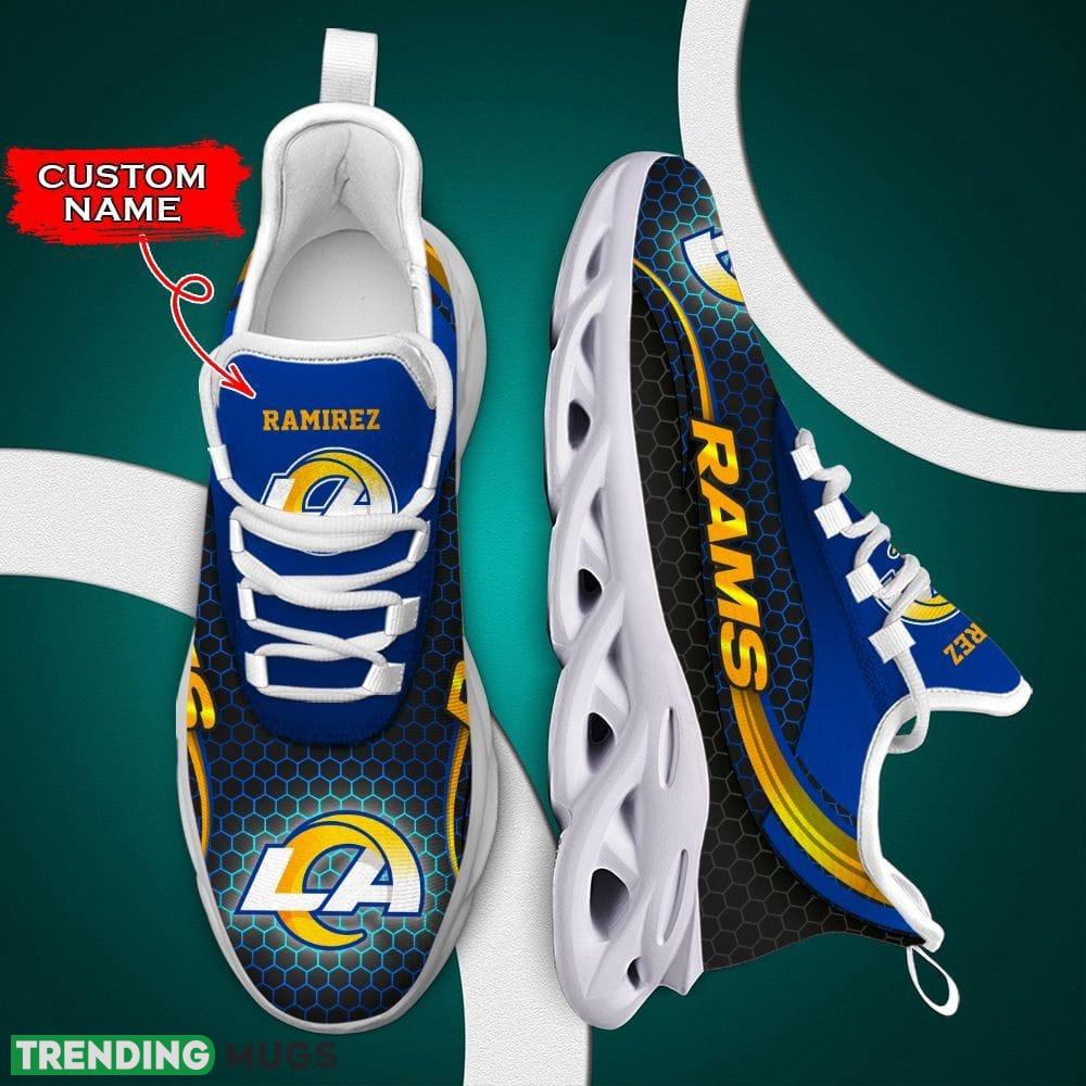 This Los Angeles Rams High-Quality Custom Name Max Soul Shoes Luxury NFL Clunky For Men Women Gift is a breathable, lightweight, and comfortable casual outdoor shoe that has a unique design. It is made of a mesh fabric which makes it sweat absorbent and breathable, while the rubber bottom ensures traction, comfort, and durability. It is available in two colors: black or white sole. There are two styles of shoelace holes so you can choose your preference.