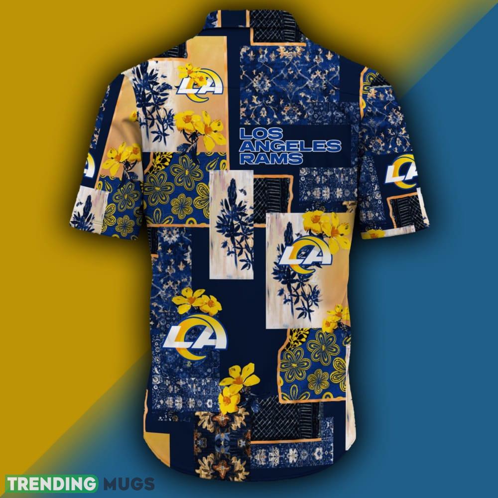 Featuring a unique US map pattern adorned with the iconic logos and colors of the Los Angeles Rams, this shirt is a must-have for any true fan. The intricate design beautifully combines your passion for the Rams with a touch of Hawaiian flair, making it the perfect addition to your game day wardrobe or casual outings.